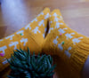The Desert Dreams socks provide a bit of Desert heat no matter the weather outside! Drift into dreams of hot sand, golden sunshine and flowering cacti. The Desert Dreams socks are knit from the cuff down and feature an afterthought heel. Waste yarn is added to the leg and the heel is added after the rest of the sock has been knit. For an additional touch of cuteness flowers can be embroidered on to some of the cacti. The socks are available in size small and size large. The instructions for both sizes are the same, the difference in size is due to a change in gauge and needle size.