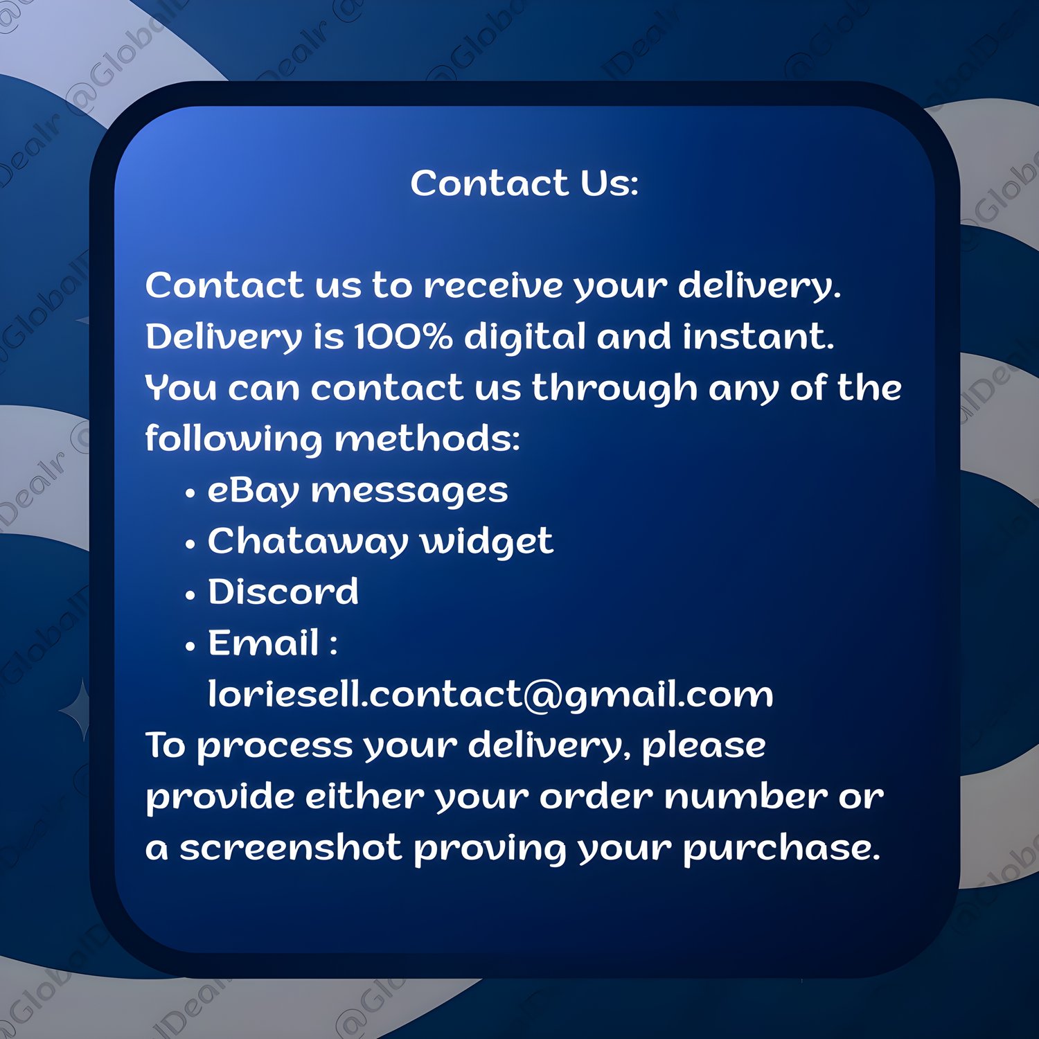 - Digital delivery via eBay messages, Chataway widget, Discord, or email .