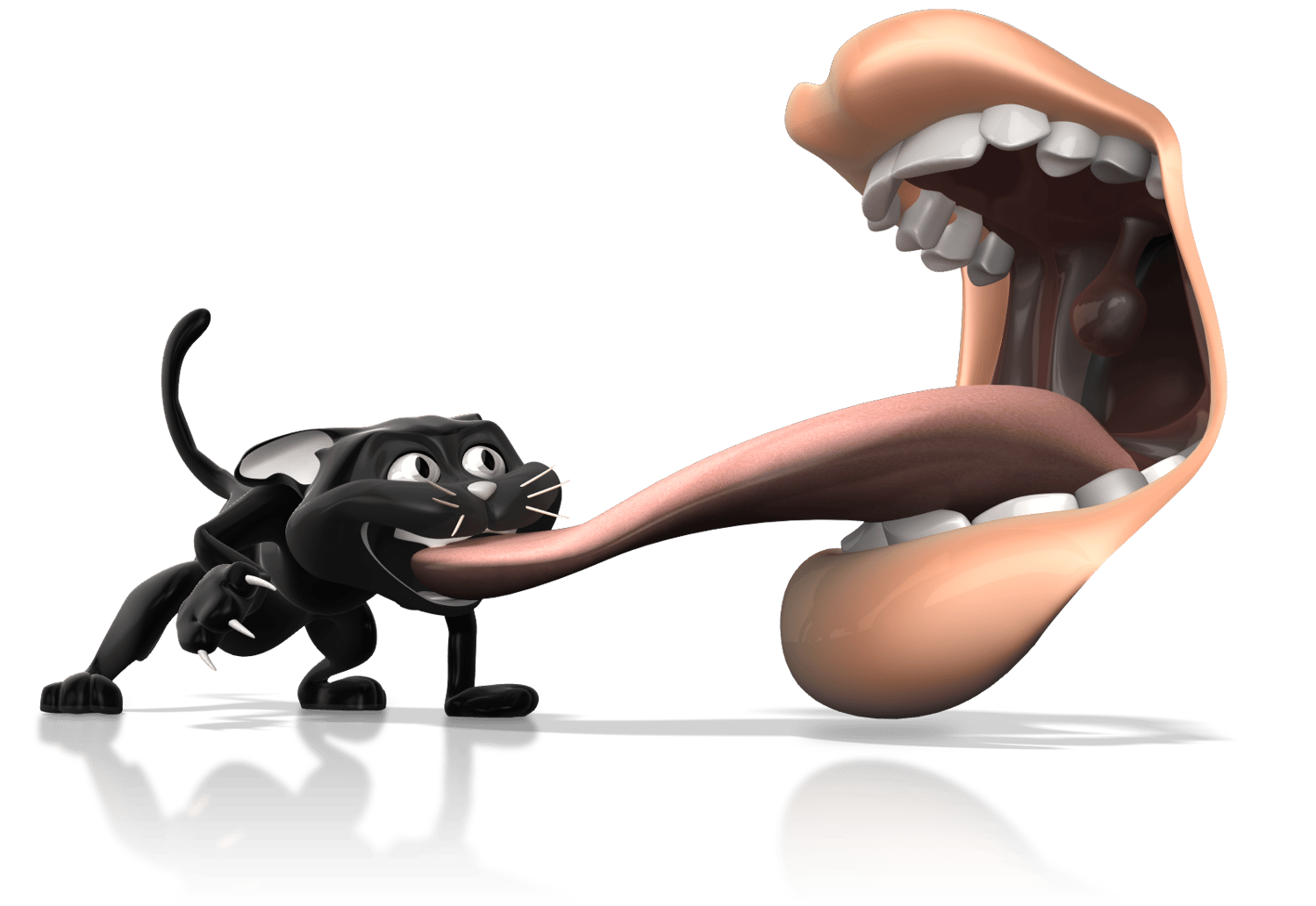 This clip art shows a cat holding onto a tongue with its mouth. Displays the idiom Cats Got Your Tongue.