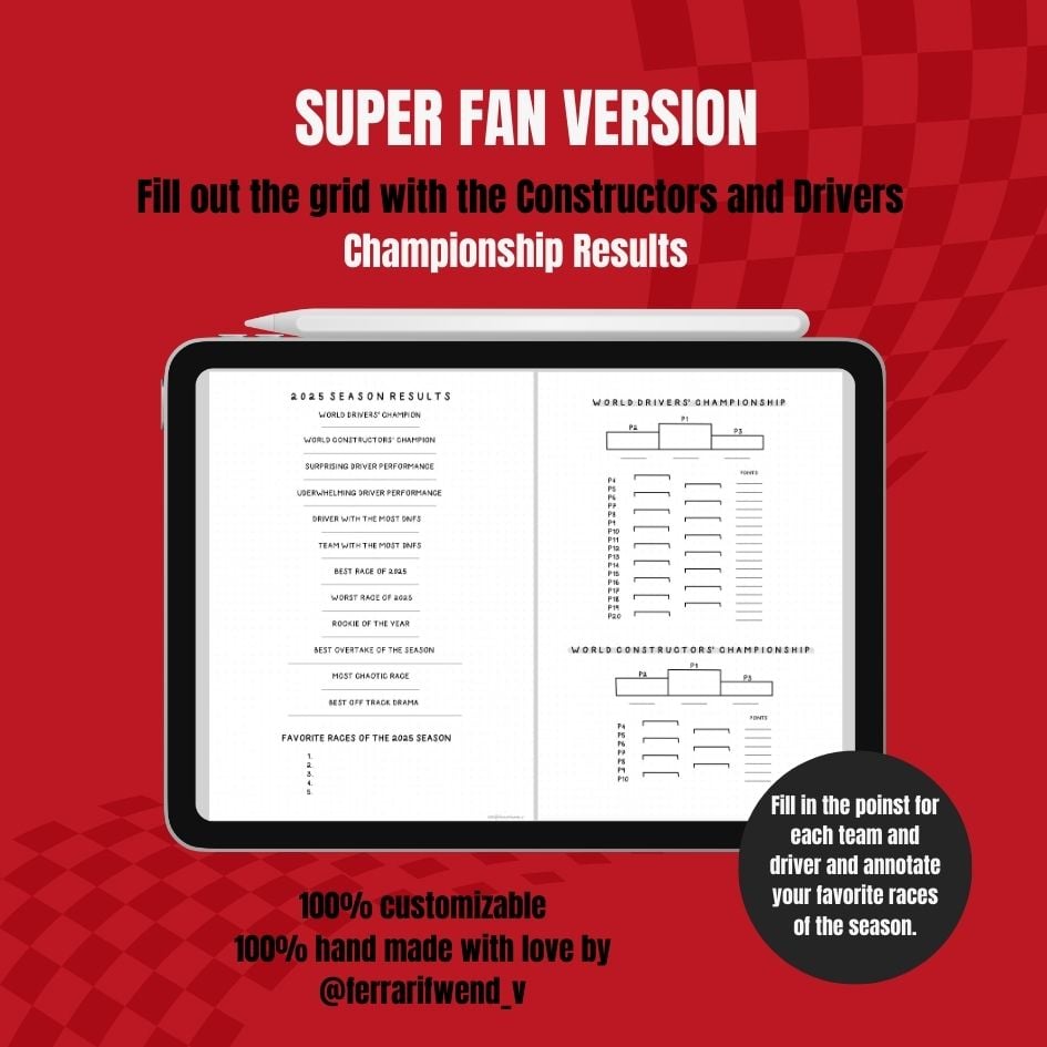 Are you a true Formula 1 Super Fan? This Digital Race Journal is designed to help you document every thrilling moment of the 2025 season! Whether you're tracking lap times, weather conditions, or race highlights, this journal ensures no detail goes unnoticed.