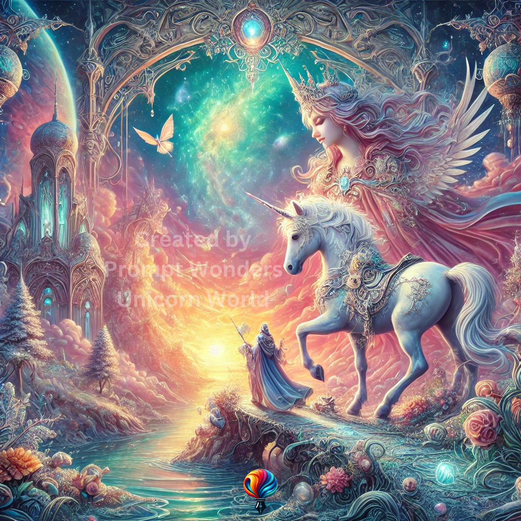 Introducing "Blessed," a mesmerizing unicorn art print that invites you into a world of gratitude and wonder. This captivating artwork depicts a radiant scene of a princess and her loyal unicorn companion, journeying through a magical landscape where colors glow with a surreal beauty. Surrounded by luminous hues and delicate, dreamlike details, this print encapsulates the spirit of thankfulness and the magical bond of friendship. Perfect for unicorn lovers and fantasy art enthusiasts, "Blessed" is designed to bring a serene and magical ambiance to any room.