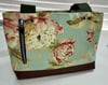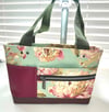 This shoulder bag is made from a beautiful Aqua and Rose floral canvas material. It has faux leather accents in a rich burgundy and brown. 1.5” webbing straps for durability. Rivet accents provide stability.
