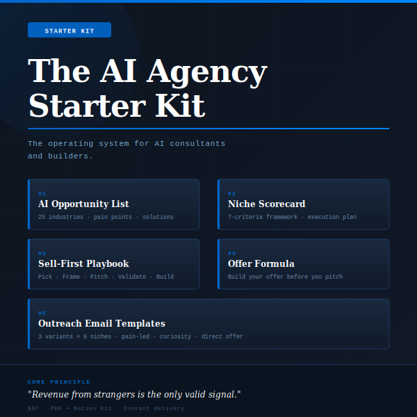 The AI Agency Starter Kit is the operating system for AI consultants and builders who want to validate before they build. It's a complete system for identifying AI opportunities, evaluating niches, and landing clients — before you invest significant time or money building anything.