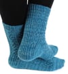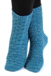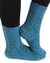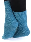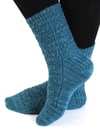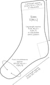 The sock pattern comes in three sizes: 66, 70, and 74 stitches. Right and left socks are mirror images of each other and can be worked two at a time.