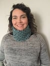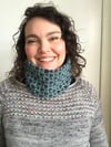 After knitting and blocking, the two ends of the cowl are joined together by picking up stitches along the cast-on edge and knitting them together with stitches already on the needles.