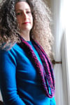 A beautiful yarn inspired a simple Moebius-shaped neckwarmer cowl. The main color is a 100% silk multi-colored iridescent yarn made in Nepal. The contrasting color is a 100% cotton chenille yarn. The Impeyan pheasant, the national bird of Nepal, has many-colored, iridescent feathers similar to the iridescence in this yarn.