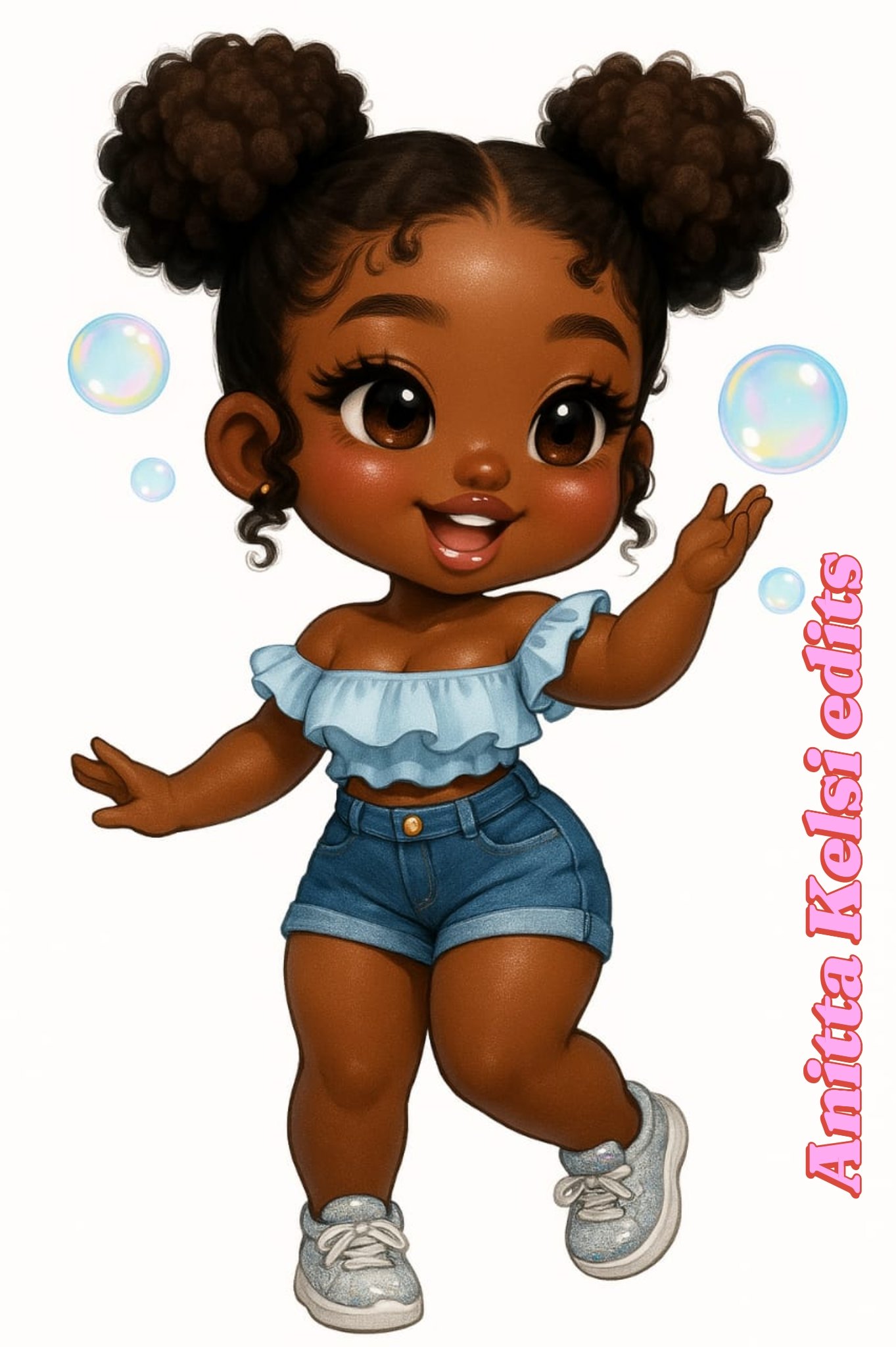 Meet your newest dose of joy — a melanin-rich chibi queen radiating playful energy and carefree vibes! With her fluffy double buns, off-shoulder ruffled top, and denim shorts, she’s ready to bounce through bubbles and brighten your day. Her white sneakers and lively pose bring movement and charm, while the colorful bubbles floating around her add a whimsical touch.