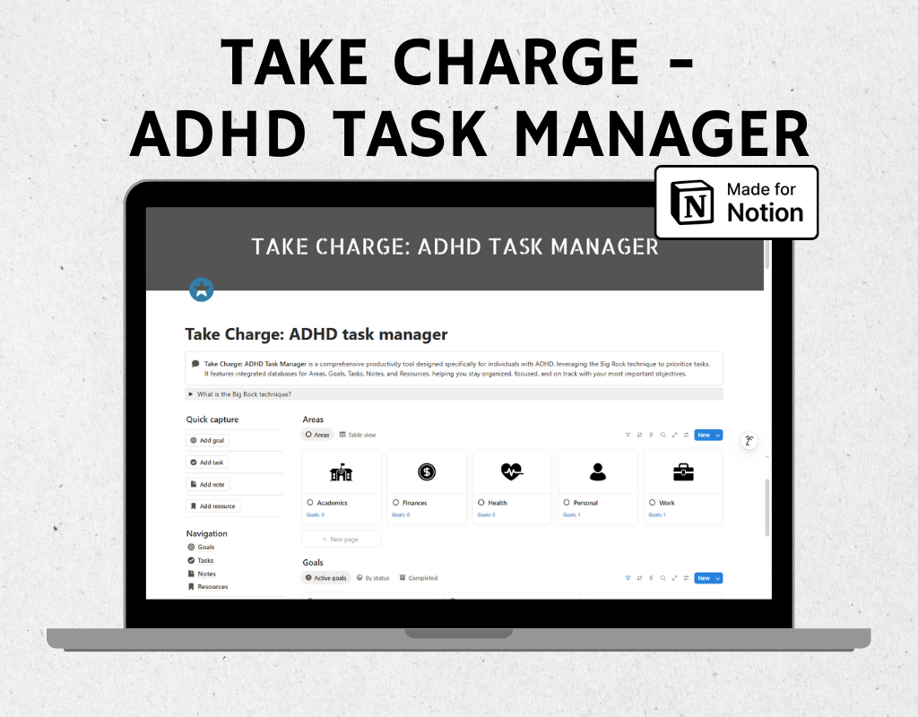 Take Charge: ADHD Task Manager is a meticulously designed Notion template tailored to help individuals with ADHD stay organized, focused, and productive. By leveraging the Big Rock technique, this template prioritizes important tasks, ensuring they get the attention they deserve. Here's a detailed look at the features and benefits: