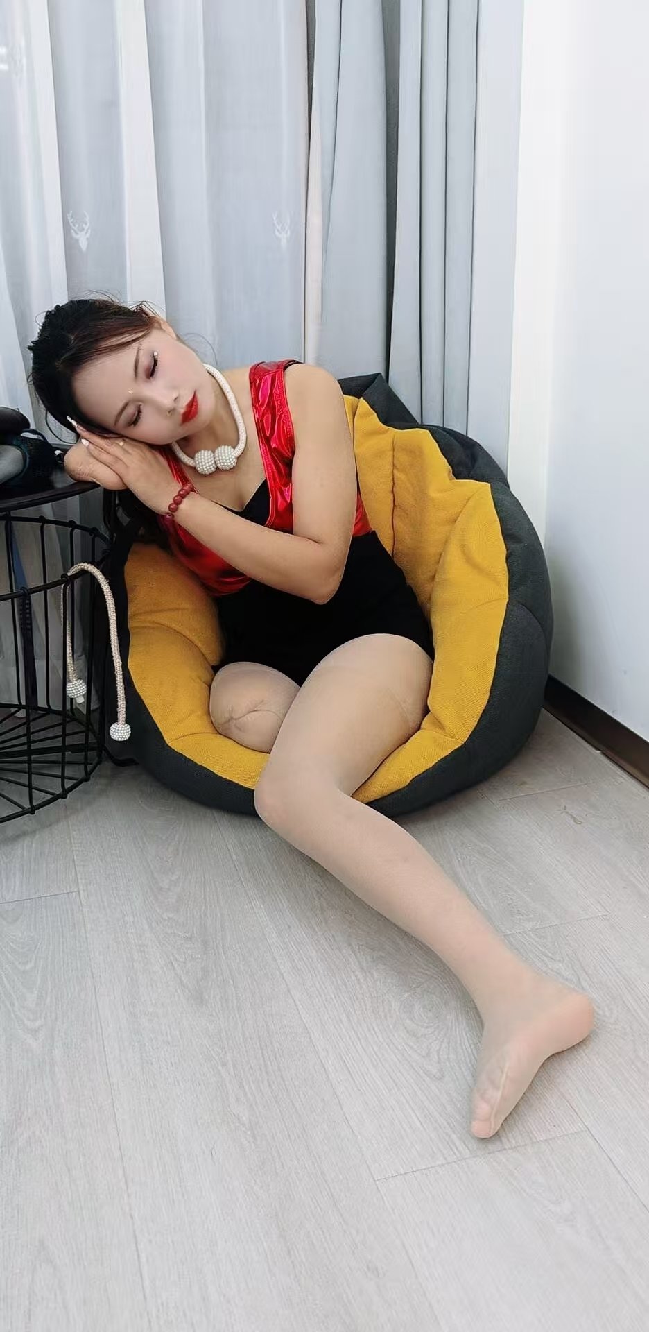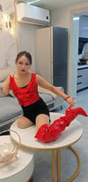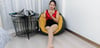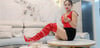 On a quiet night, in a brightly lit room, Abby is wearing hot red boots.