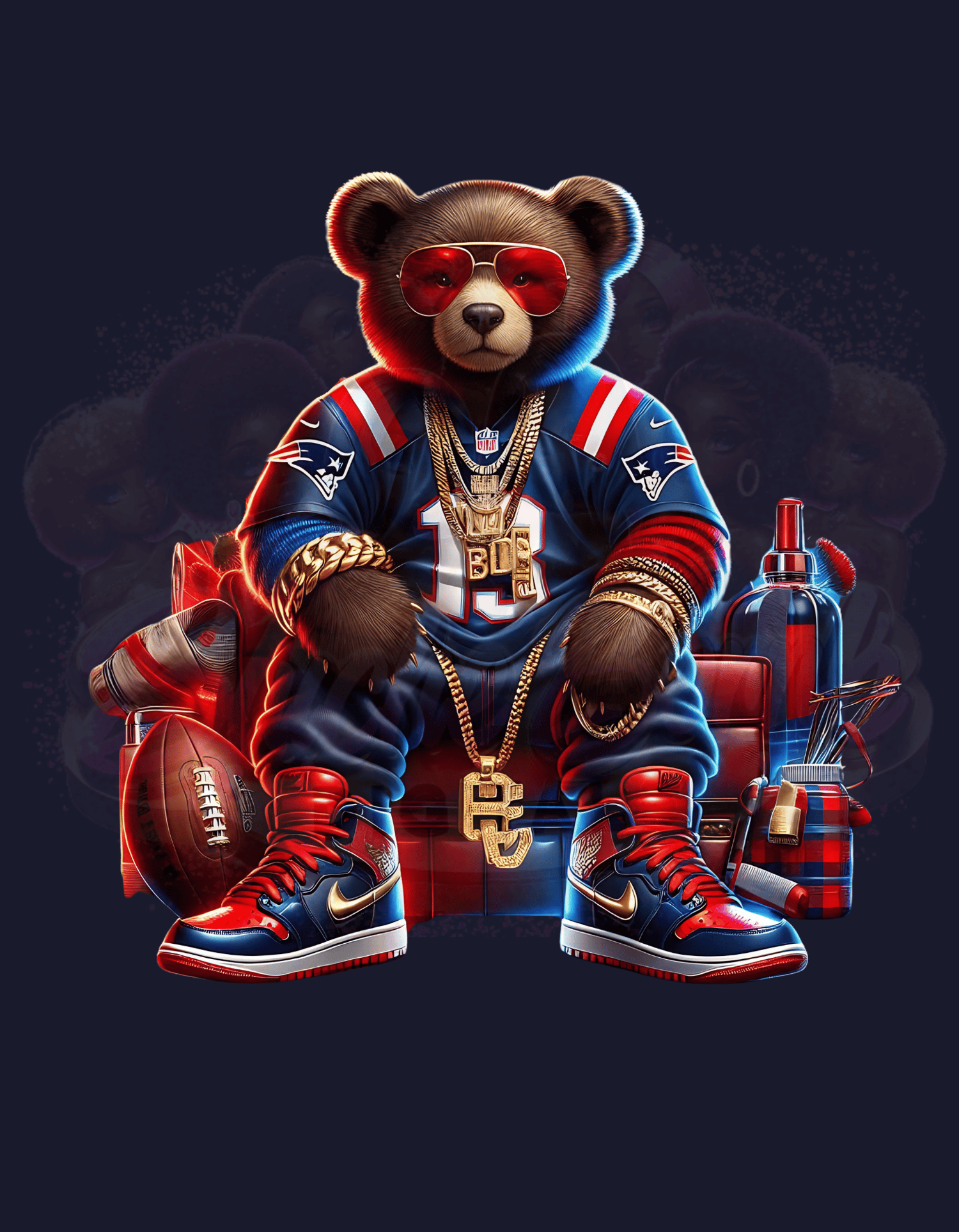 "Level up your creative projects with this high-quality PNG digital download of a stylish, hip-hop-inspired bear in NFL-themed apparel. Perfect for New England Patriots fans, this design features intricate details like gold chains, sneakers, and sunglasses, blending urban streetwear with sports culture. Use this transparent background PNG for custom T-shirts, mugs, posters, stickers, and more. Instantly downloadable, this digital file is perfect for crafters, designers, and football enthusiasts alike.