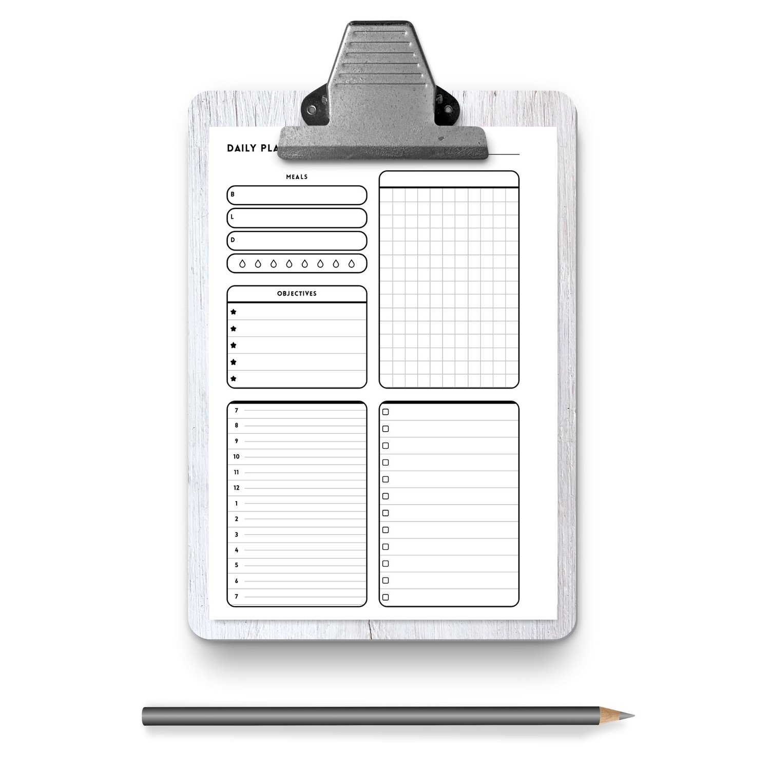 - Plan Your Day: Fill in the schedule, meal plan, objectives, and to-do list sections.