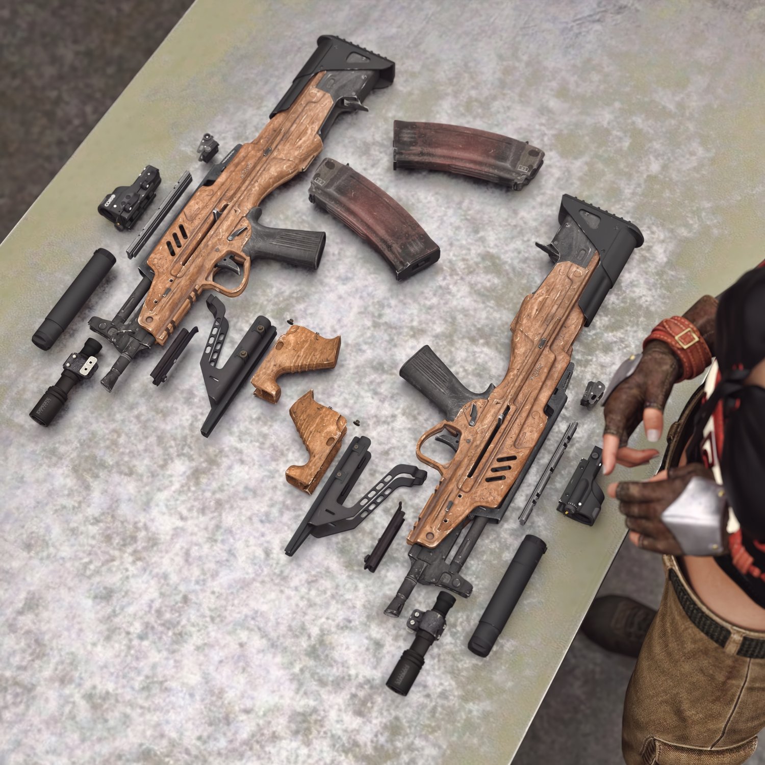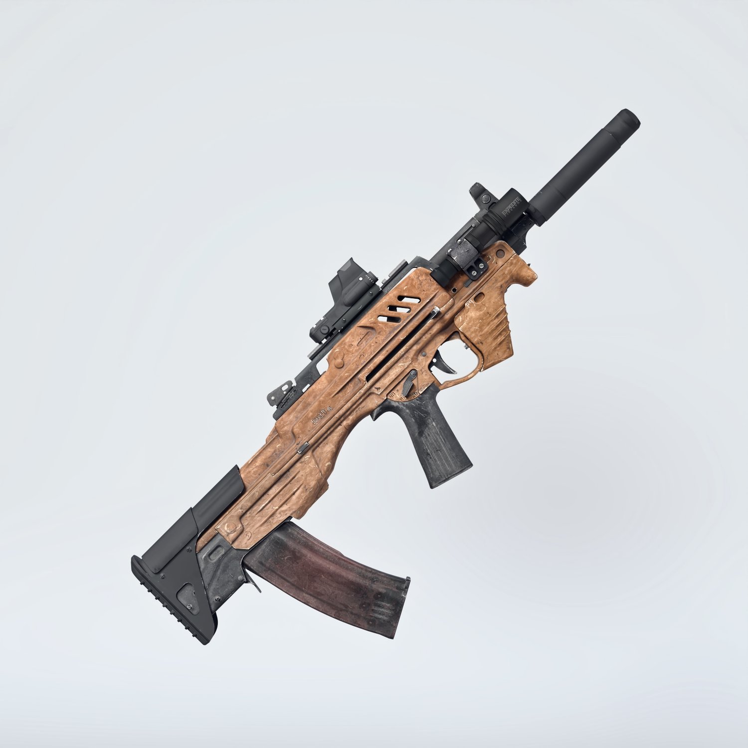 A super cool soviet bullpup assault rifle, rigged and converted for use with DAZ. Developed during the soviet era as a new assault rifle, it unfortunately was too innovative and complicated for real use. Yet, it looks cool and weird, so can be used in special operations pics or sci fi setting. Trigger, safety, bolt, etc also rigged for more realistic pictures. Includes a lot of accessories and variants- a red dot sight with a rail, light, silencer, front grip, so you have some options. Rear iron sight can be hidden if needed.