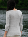 Worked in one piece from the shoulders-down and almost entirely in the round, the 2x2 ribbing on the back and sleeves contrasts with double garter st on the front. The set-in sleeves are created seamlessly with the upper bodice in a technique originally described by Barbara Walker (photo tutorial included).