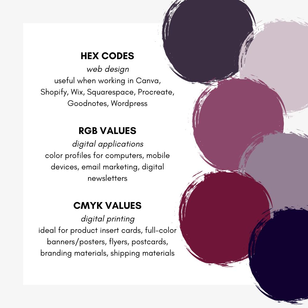 + Detailed Hex Codes, RGB, and CMYK values for each color