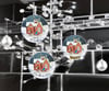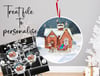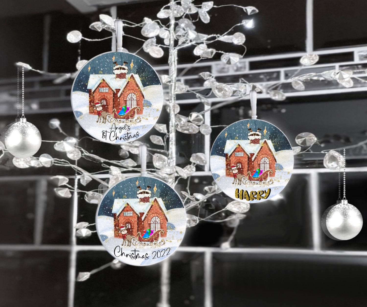 Chrstmas bauble design with a cute house showing Santa stuck in the chimney, whilst his super cute reindeer waits patiently by the sleigh. Gold elements.