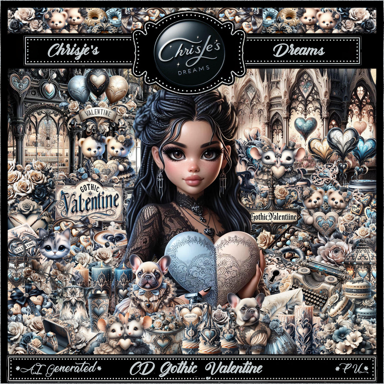 Gothic Valentine is a ❤️valentine❤️ themed kit which contains 112 elements, 9 Frames, 10 papers and 2 beautiful AI generated png tubes by Chrisje's Dreams.