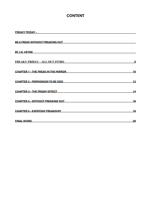 You’ll get a short, sharp, and slightly absurd manifesto that hands you the permission slip to be your freakiest self—without losing your cool. 21 pages of weird, witty, freedom-fueled philosophy.