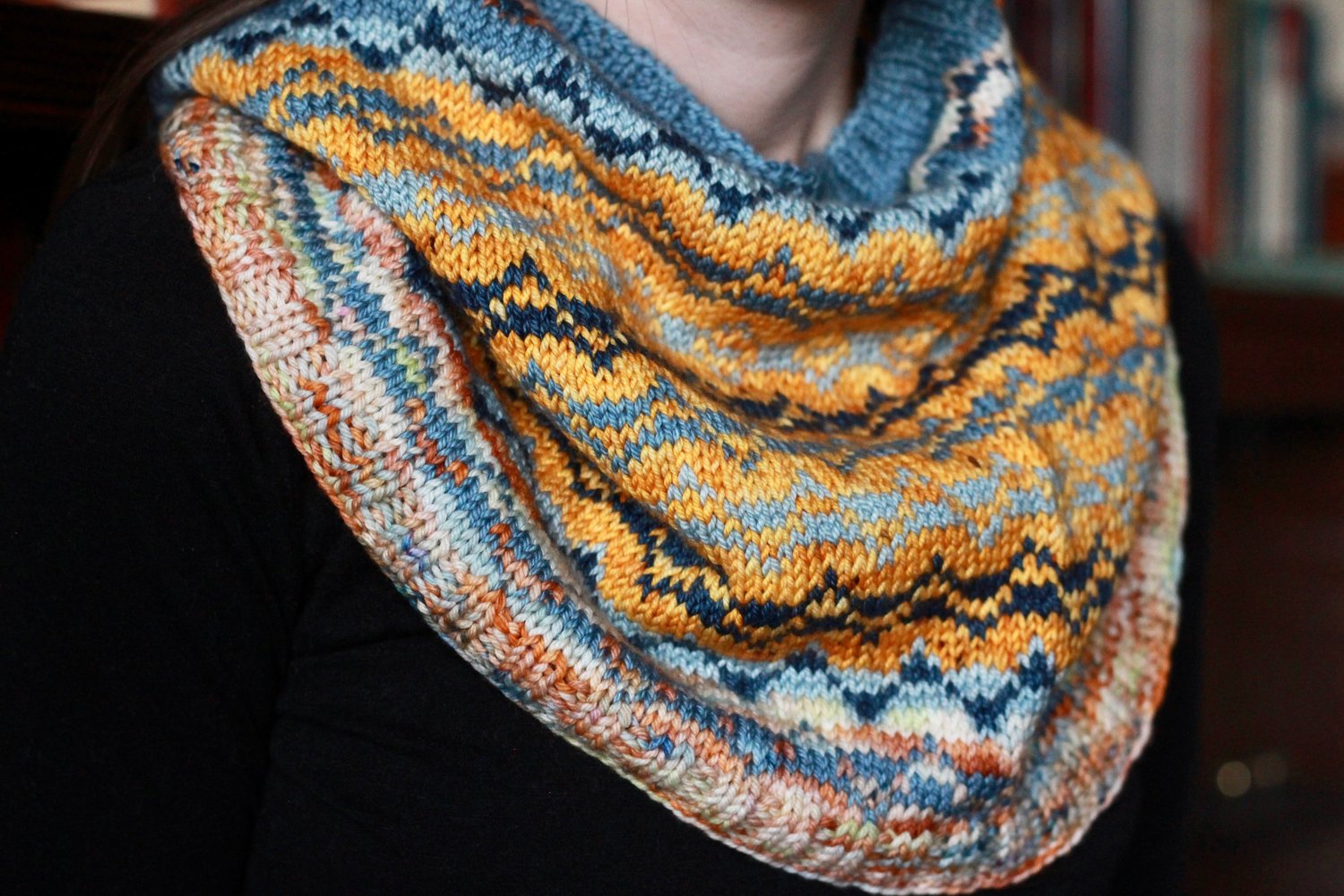 The Dwarrodelf Cowl is a fun and easy colorwork cowl pattern that provides many options for customization and stash busting. It includes two colorwork charts, one with two colors and one with three. You can work the whole cowl with one of these charts or mix and match them, as I did! It is perfect for using up scraps from previous projects, which is what I did when designing the cowl, as you can see from the pattern photos. I hope you have fun with this one, and I can’t wait to see all your wonderful versions!