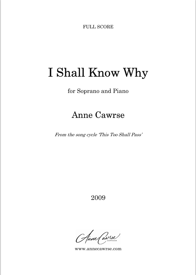 I Shall Know Why is a setting of the poem of the same name by Emily Dickinson. The lyrics include a reference to Psalm 23. It forms a part of the song cycle ‘This Too Shall Pass’.