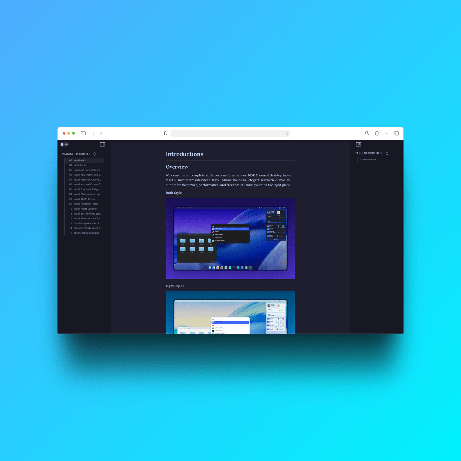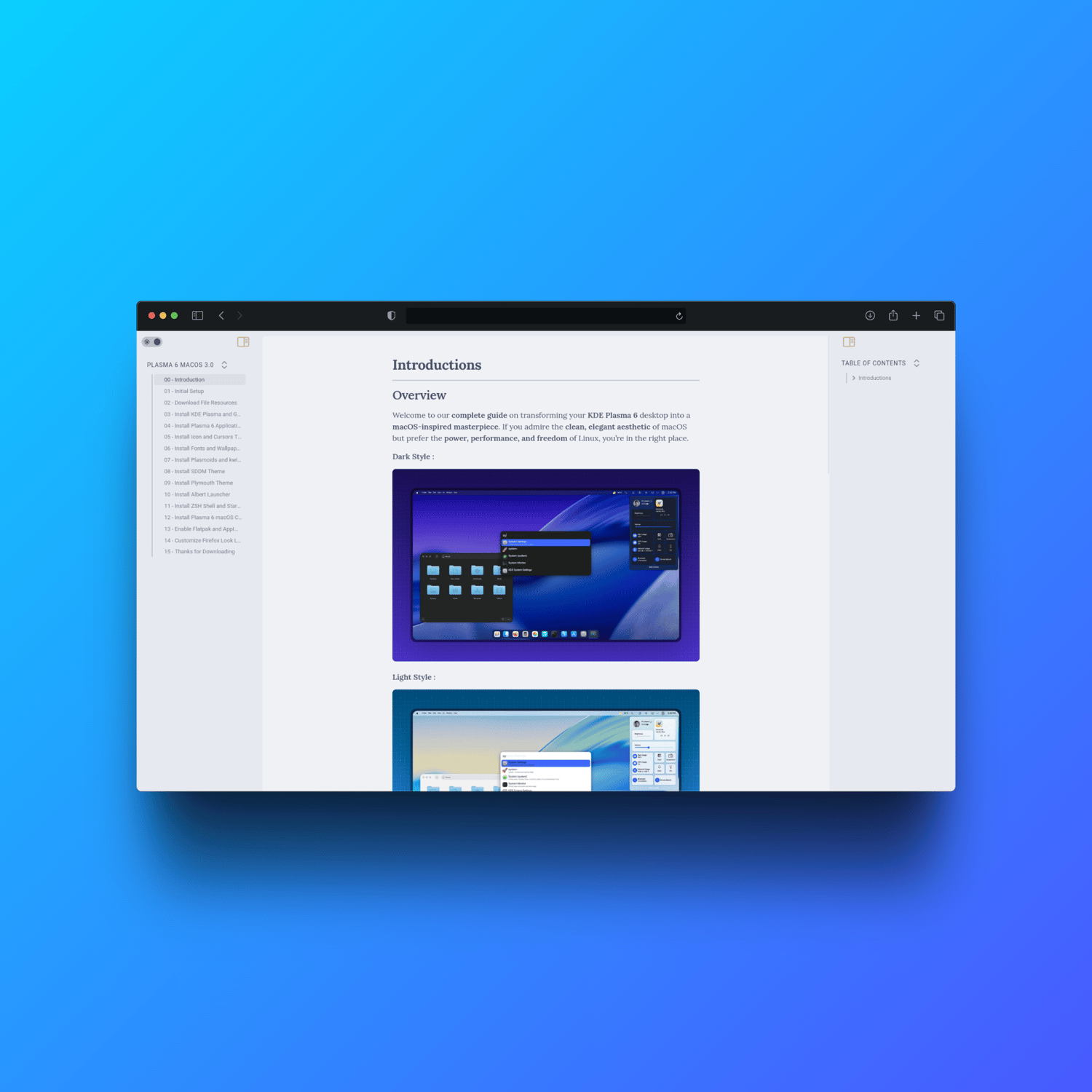 Transform your KDE Plasma 6 desktop into a stunning macOS-like interface with this complete, beginner-friendly documentation. Whether you're a KDE power user or just starting your Linux customization journey, this guide gives you everything you need to replicate the sleek, polished aesthetic of macOS—without leaving the flexibility of Linux.