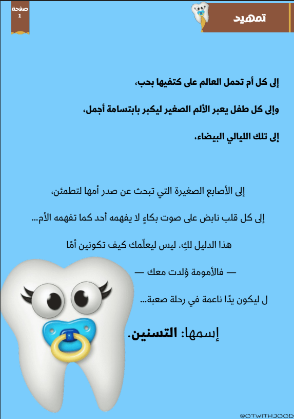 تمرّ كل أم برحلة مليئة بالقلق والتعب في مرحلة التسنين، بين البكاء المتواصل، وقلة النوم، والحيرة أمام ما يجب فعله لمساعدة صغيرها. هذا الكتاب صُمّم خصيصًا ليكون رفيقكِ العملي والأقرب لكِ خلال هذه المرحلة الحسّاسة، بأسلوب مبسّط ومعلومات موثوقة وتطبيقات واقعية يمكنكِ تنفيذها فورًا