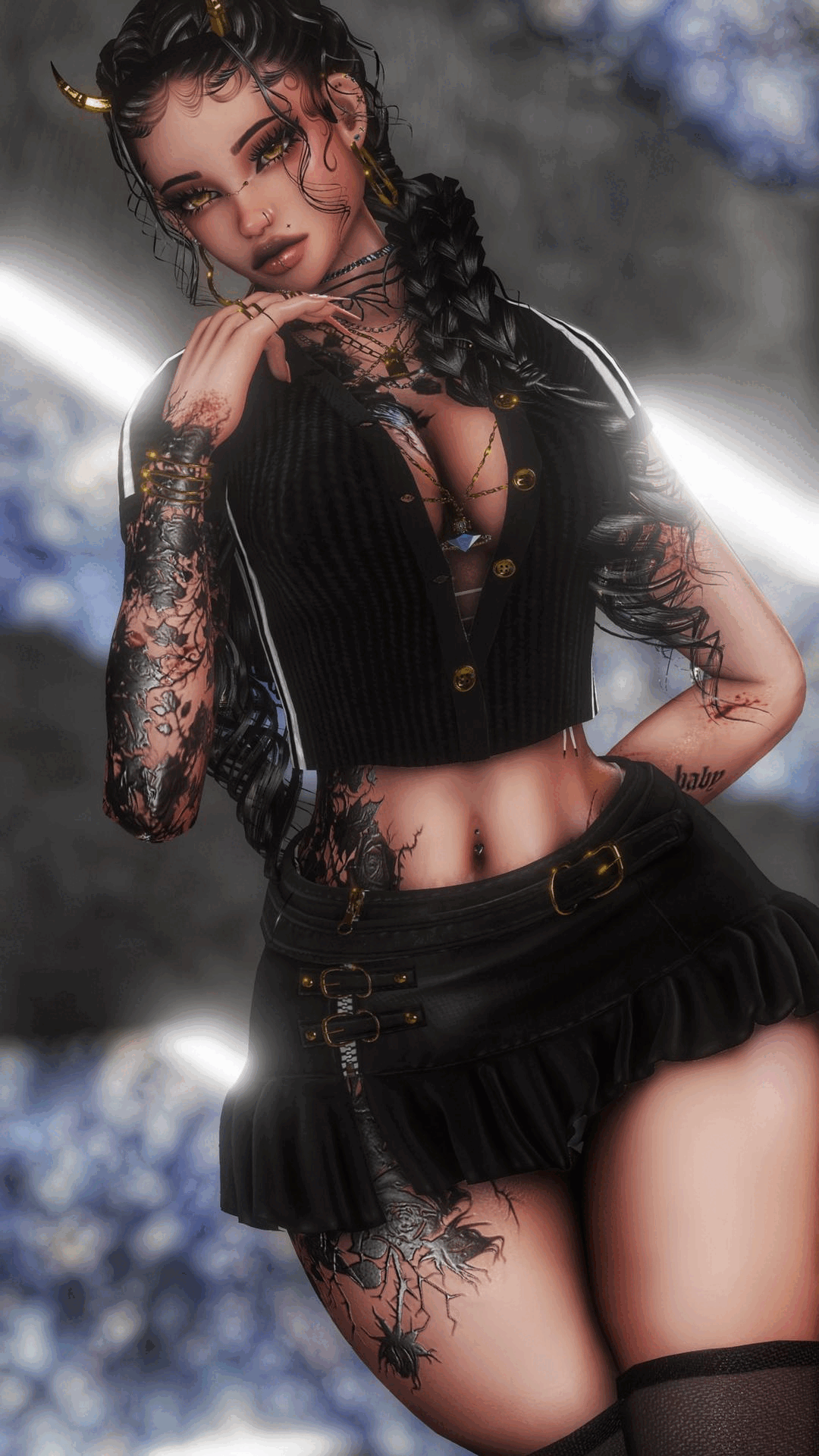 Body (Edit by me no reuse), Head (Edit by me NO reuse), Stockings, Winter outfit, Sneakers Buns Top Bikini, Skirt Corset, Short hair, Ears Tail, Long hair, Pants Braided hair, Glasses, Earpiercings, Bodytexture, Boots, Heels Nails Top 2 Stockings 2, Long curls, Bone Eyepatch Horns, Ponytail, Nip piercings, tatoos