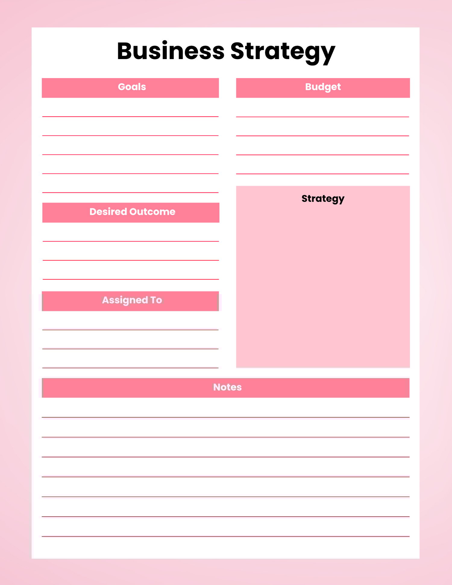 - Business & Personal Goals: Dedicated pages for setting SMART goals (Specific, Measurable, Attainable, Relevant, Time-Based) (p. 23) and outlining detailed business strategies (p. 22).