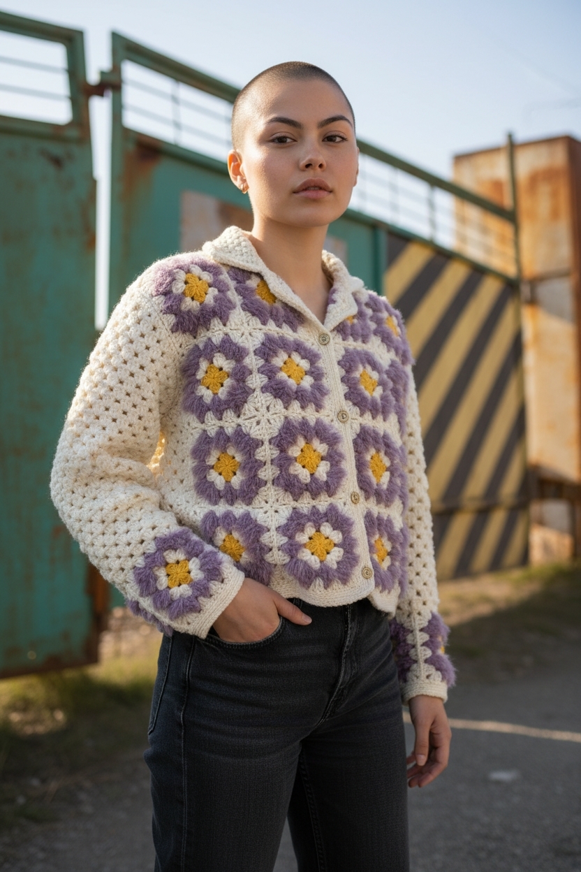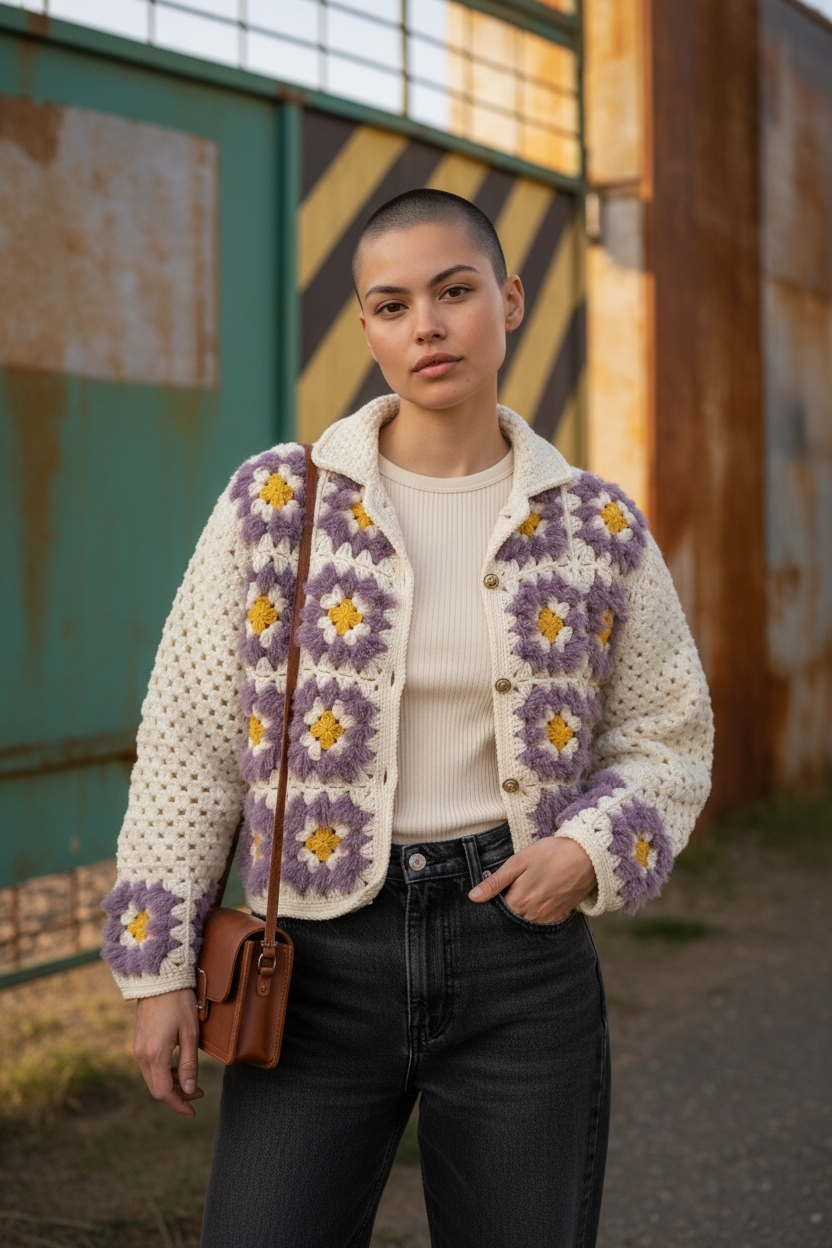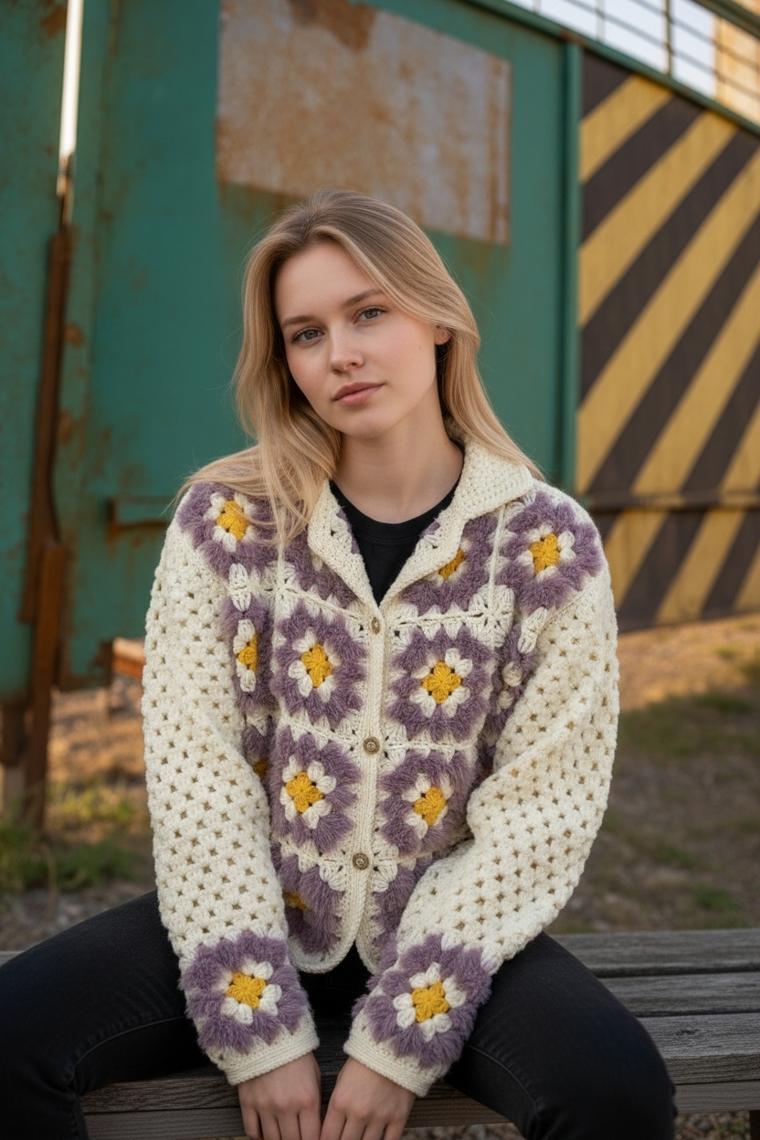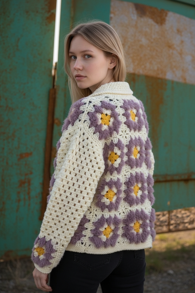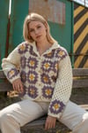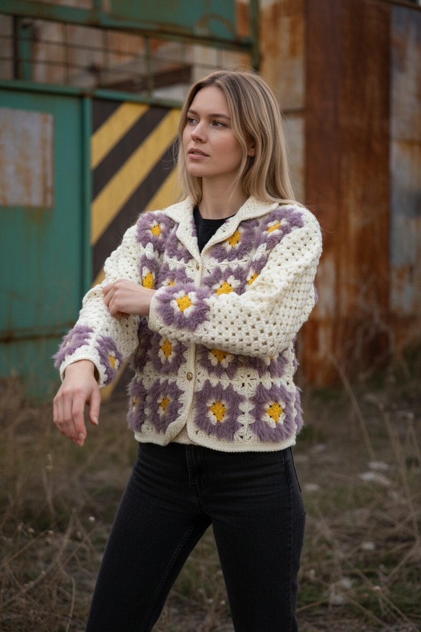 This unique handmade cardigan combines the classic granny square technique with contemporary design, creating a statement piece that truly stands out. The front and back are adorned with characteristic floral granny squares in soft shades of lilac, cream, and mustard yellow, while the sleeves and collar are crocheted in a unified cream color with an open stitch pattern. The cardigan fastens with wooden buttons that add a bohemian touch.