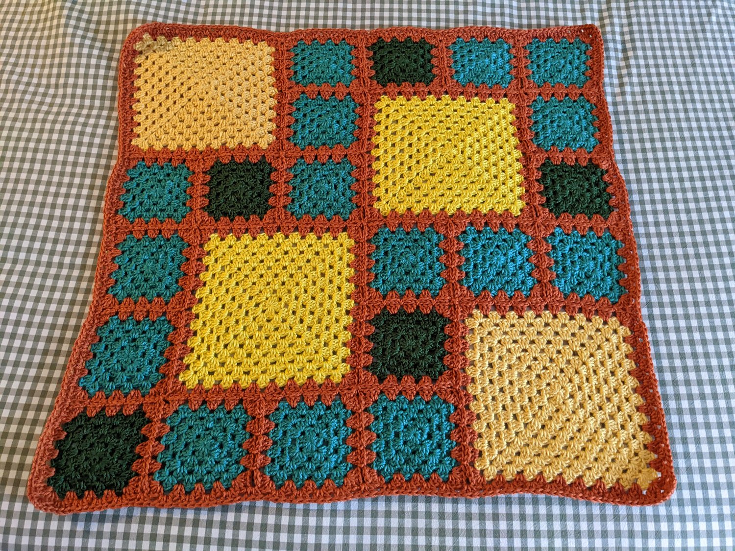 This was designed with using up scraps in mind. Gauge isn’t critical, as granny squares are quite forgiving.