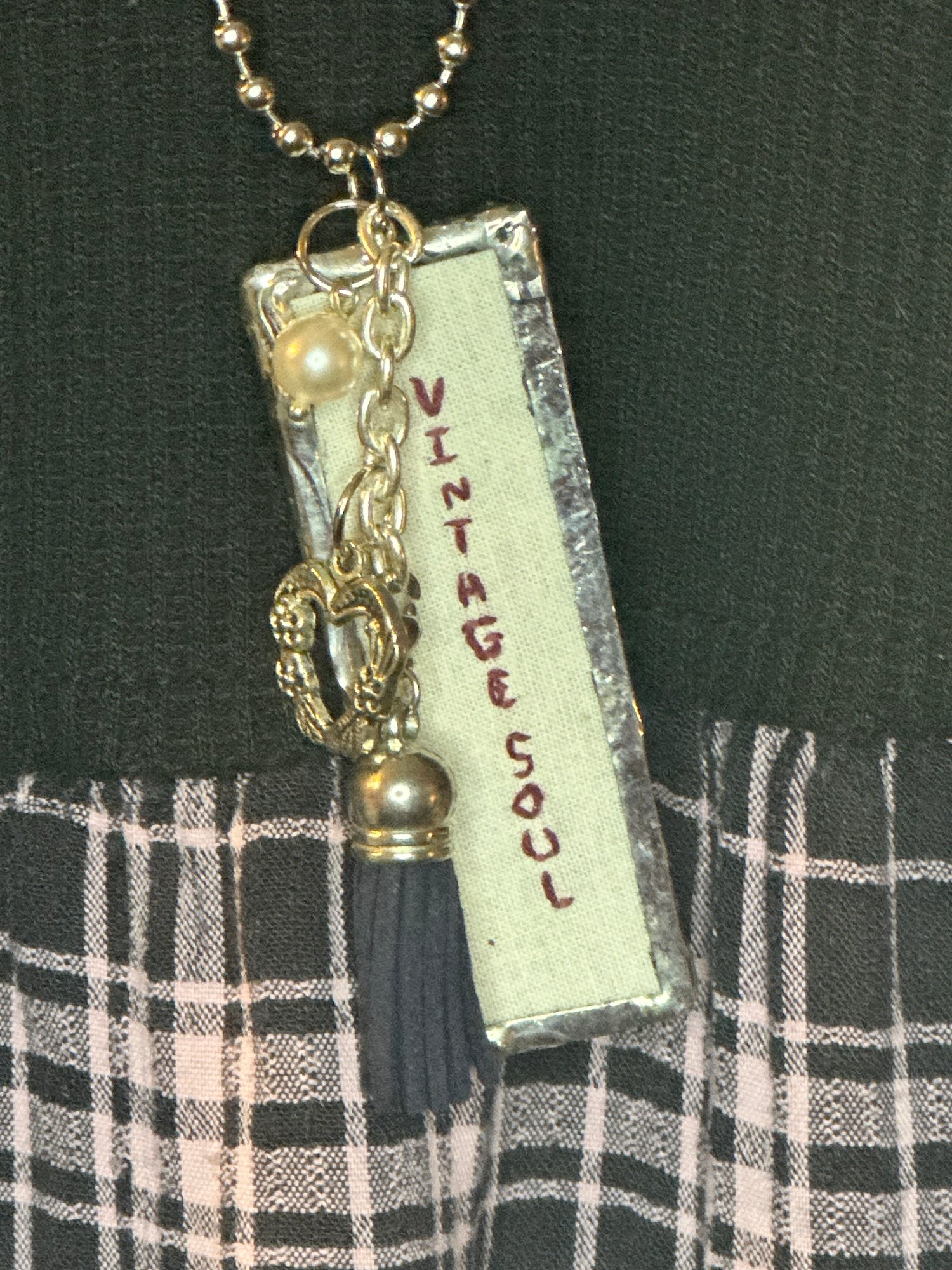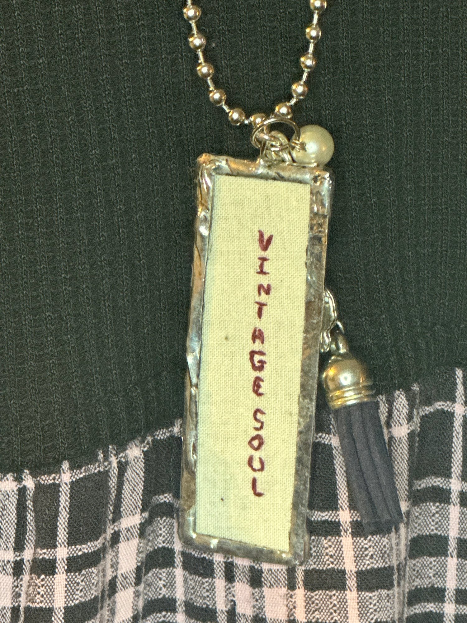 - Hand-stitched fabric pendant with embroidered “Vintage Soul” phrase