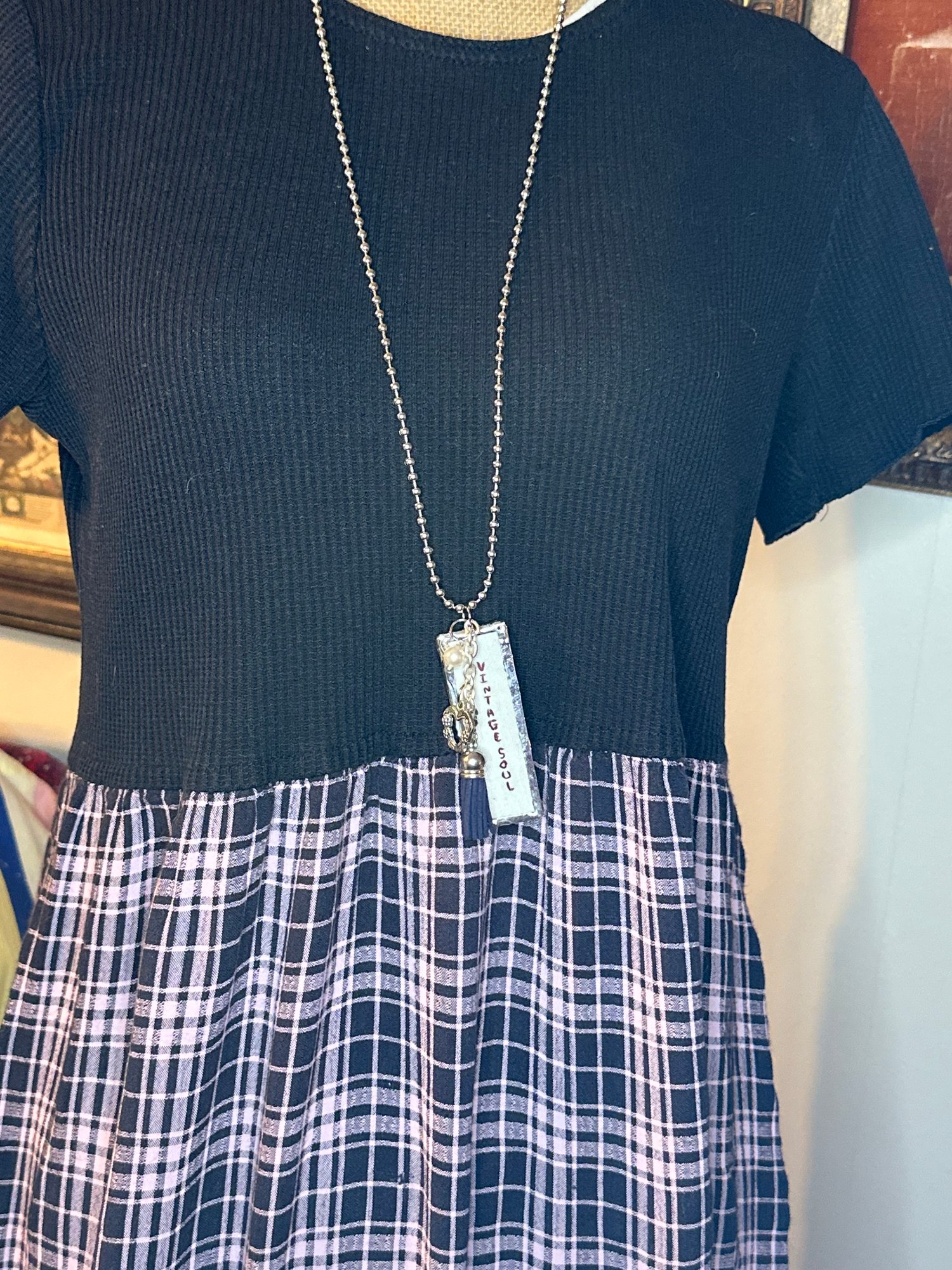 Celebrate your vintage spirit with this one-of-a-kind textile pendant necklace. The hand-stitched phrase “Vintage Soul” is embroidered in rich burgundy thread on natural fabric, framed in silver solder for a rustic yet polished finish. Dangling accents — including a pearl bead, ornate charm, and soft tassel — add texture and movement, making this piece both playful and meaningful.