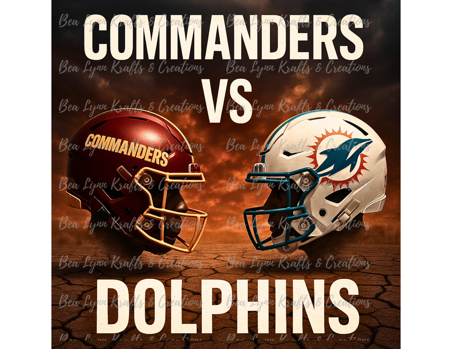 This ultra-realistic “Commanders vs Dolphins” rivalry PNG features two detailed football helmets facing off in an intense, dramatic battle scene. The Washington Commanders helmet shines in deep burgundy and gold, while the Miami Dolphins helmet stands out with crisp teal, orange, and white detailing. Set against a stormy sky and a cracked battlefield ground, this artwork delivers a bold, high-energy sports aesthetic perfect for football fans.