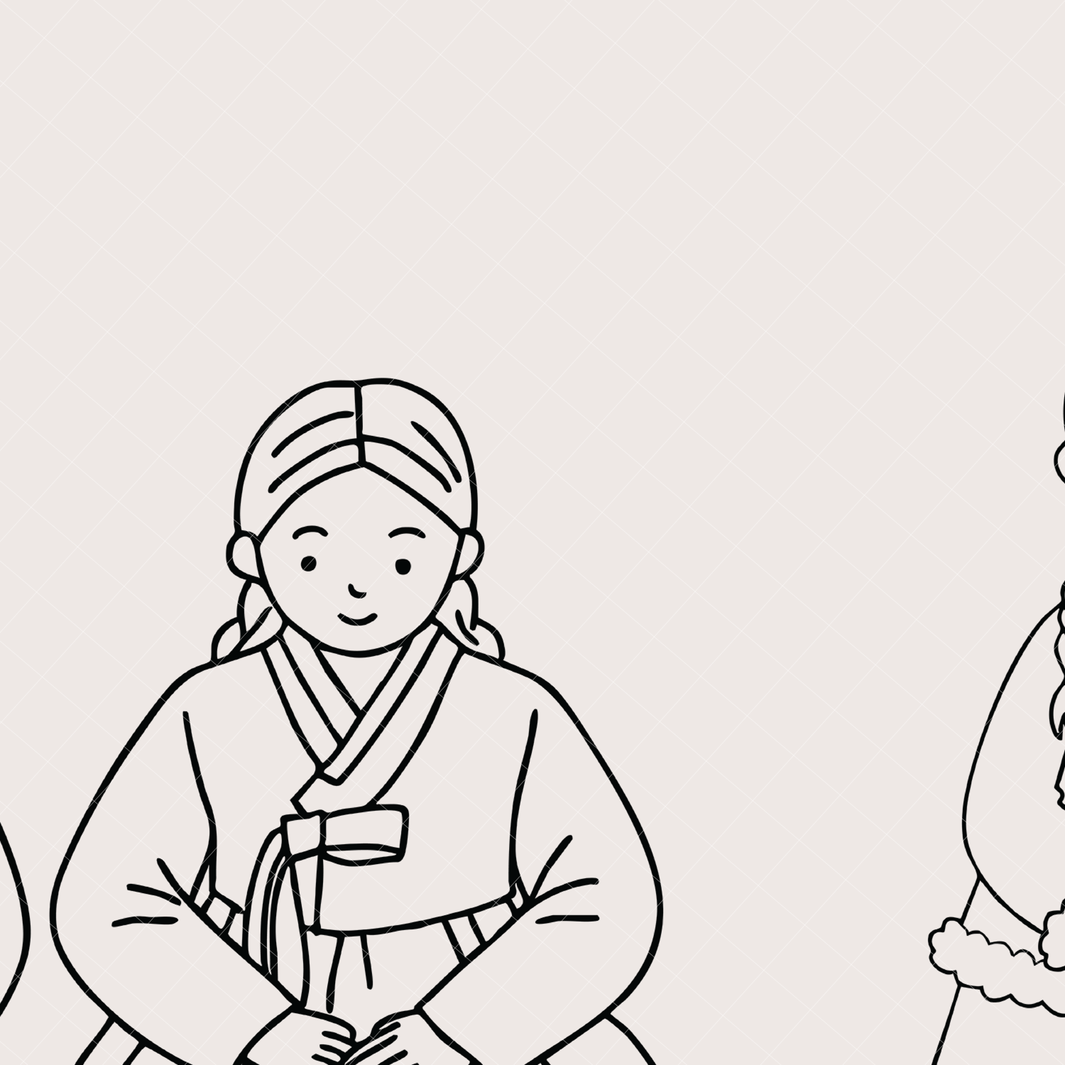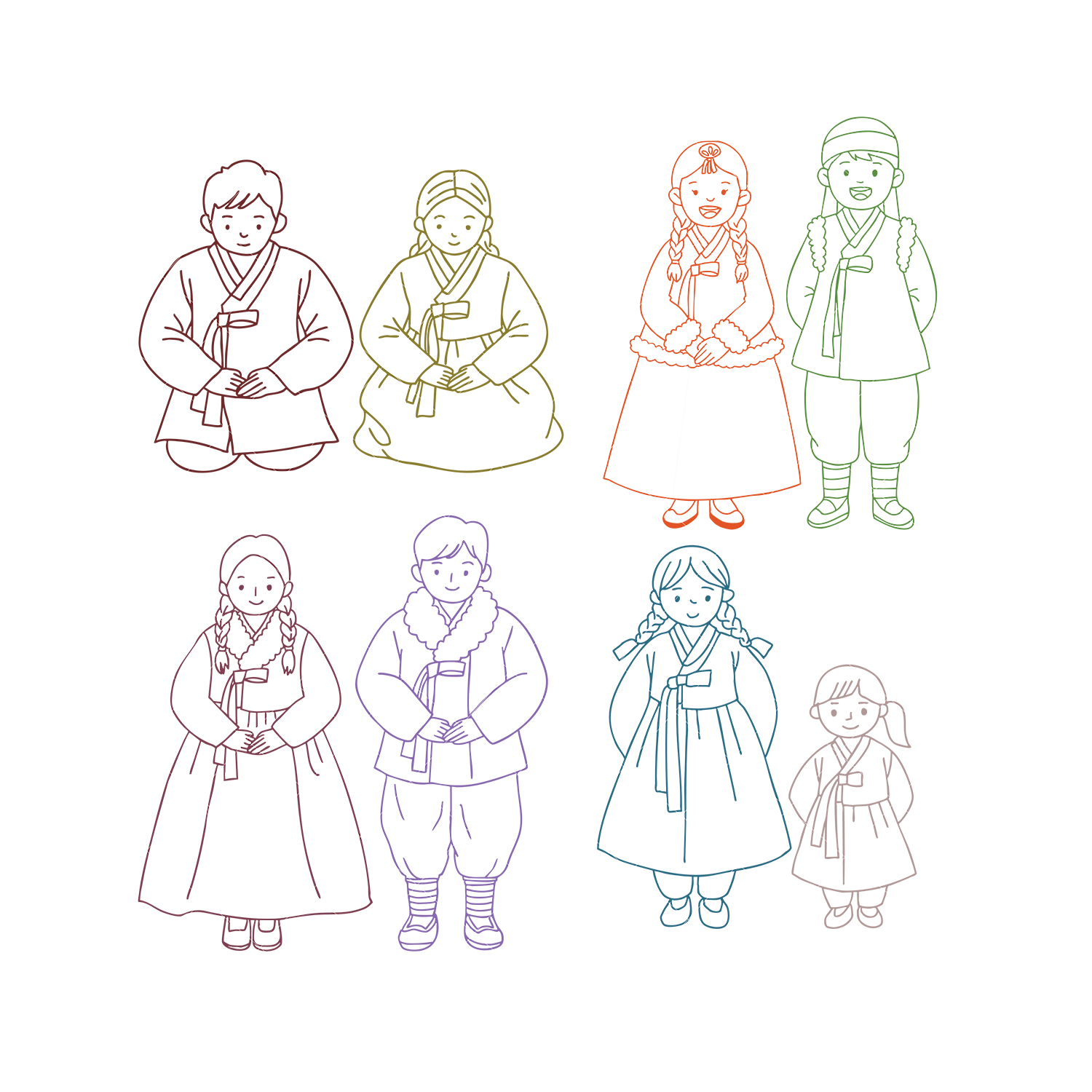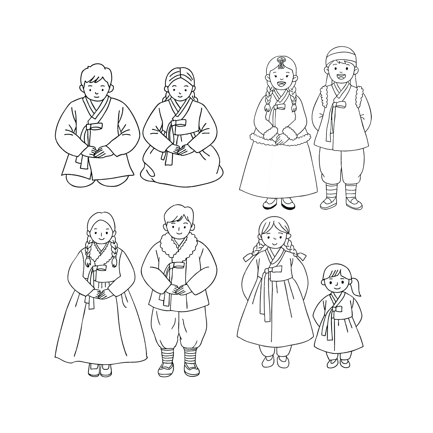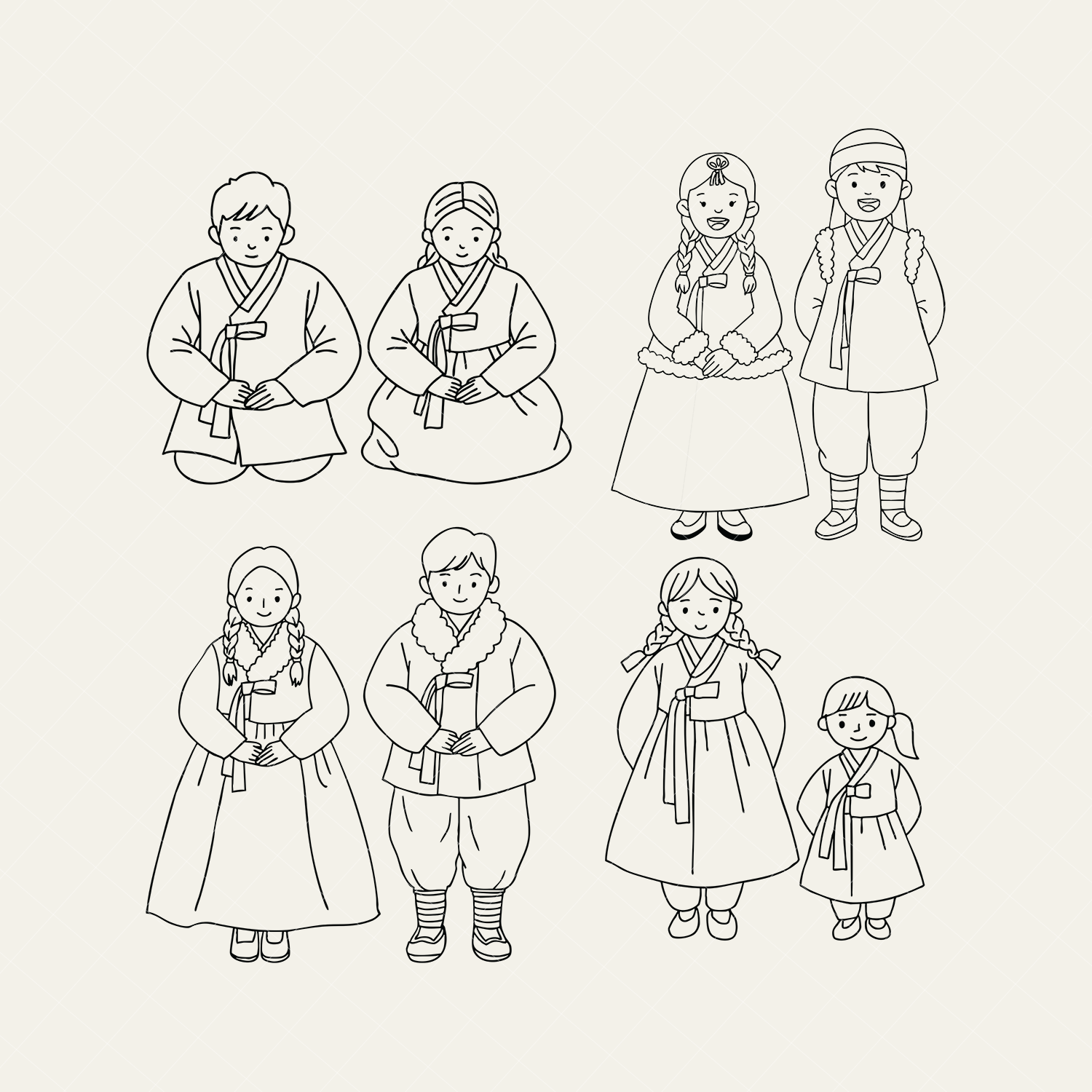Hand-drawn Lunar New Year (Seollal) Hanbok Characters Line Drawing Clipart – PNG & SVG | 8 Illustrations