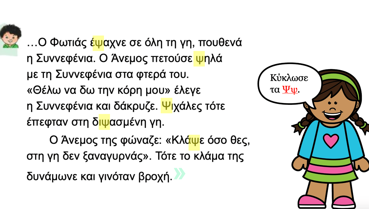 Η παρουσίαση αυτή αφορά την ενότητα «Ψιχάλες» από το μάθημα της Γλώσσας της Α΄ τάξης, μέσα από την οποία οι μαθητές γνωρίζουν το γράμμα Ψ, ψ.