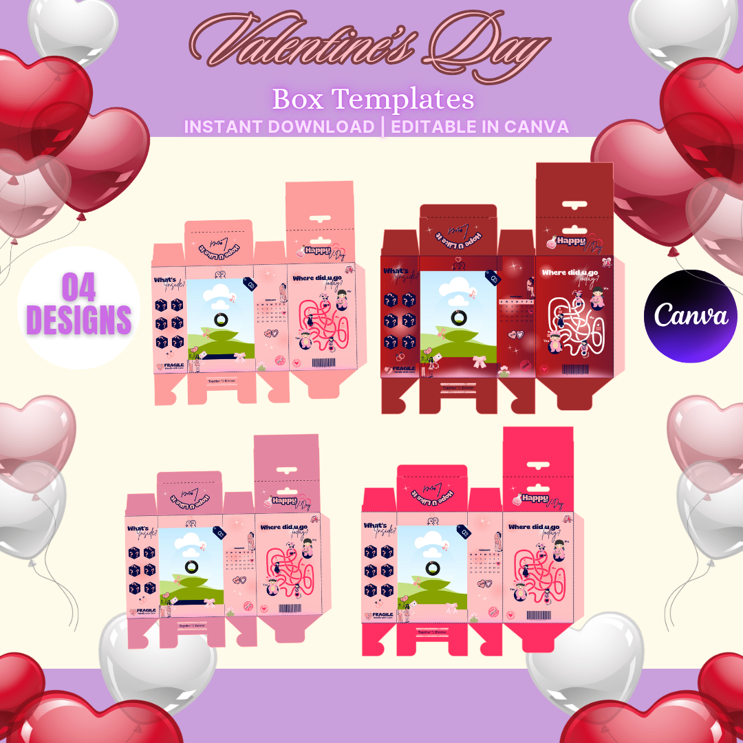 This digital set includes 4 unique Valentine-themed box designs, perfect for treats, small gifts, party favors, and small business packaging.