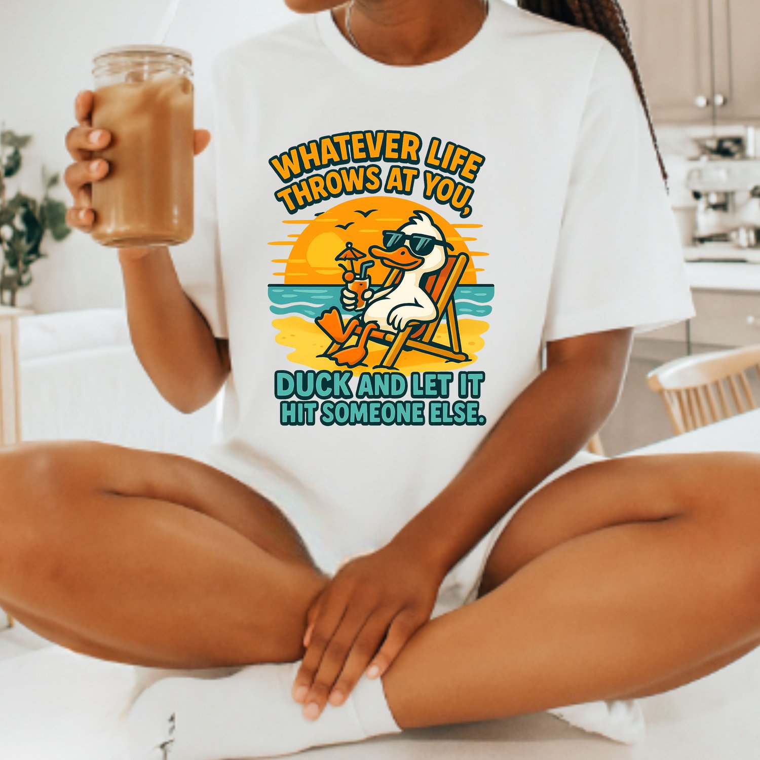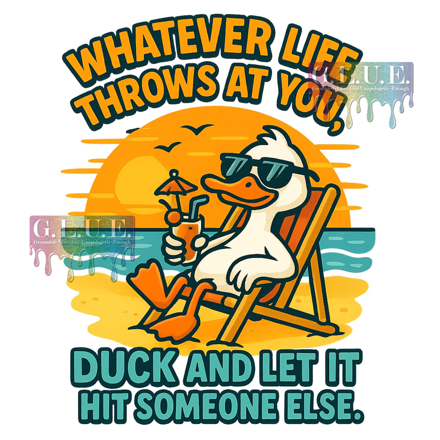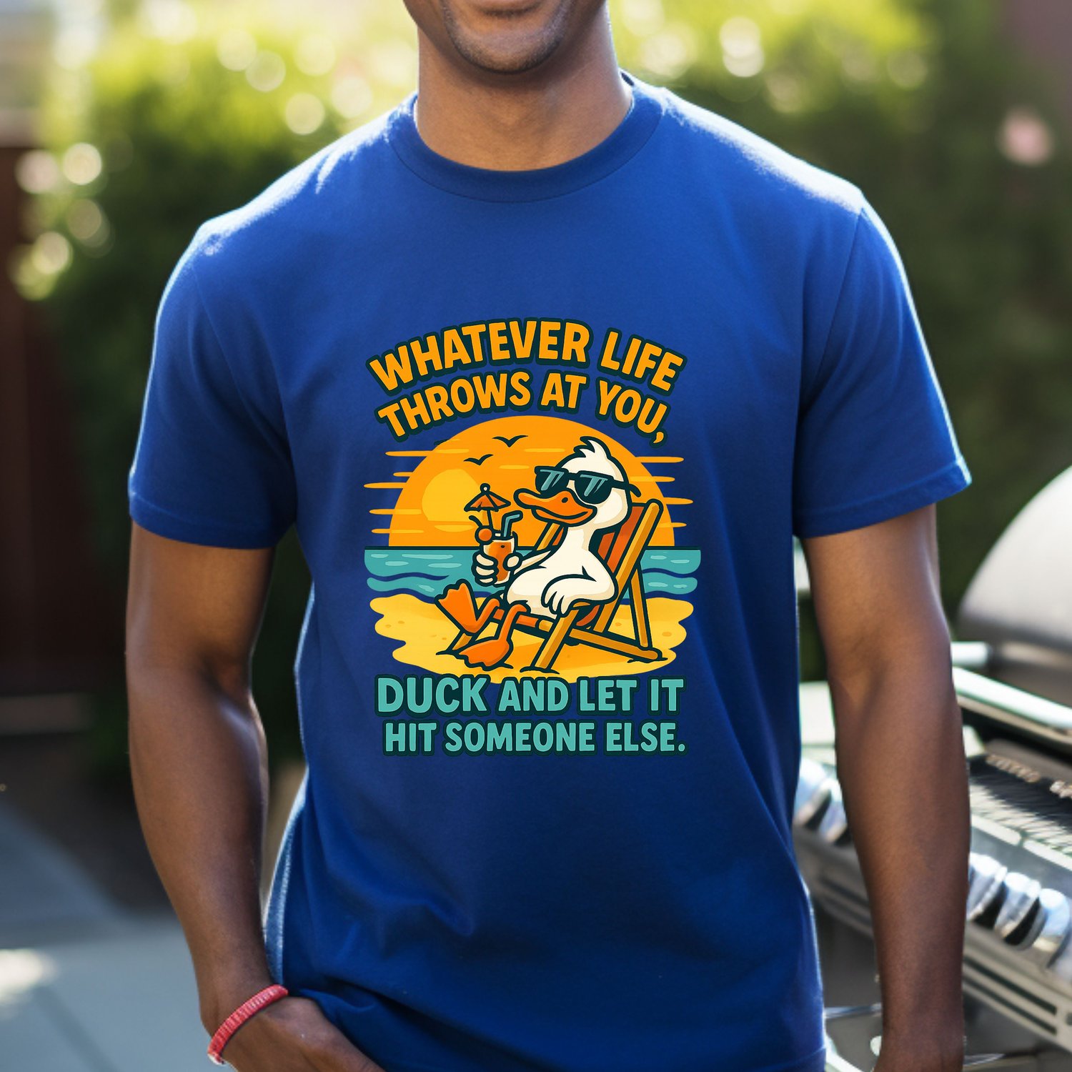 This one's hilarious and totally chill—just like the duck! With tropical vibes, sunglasses, and a savage twist on life advice, this design is perfect for summer tees, beach mugs, or funny gifts. Take a lesson from this laid-back duck: when life starts throwing stuff your way—just duck and let it hit someone else.
