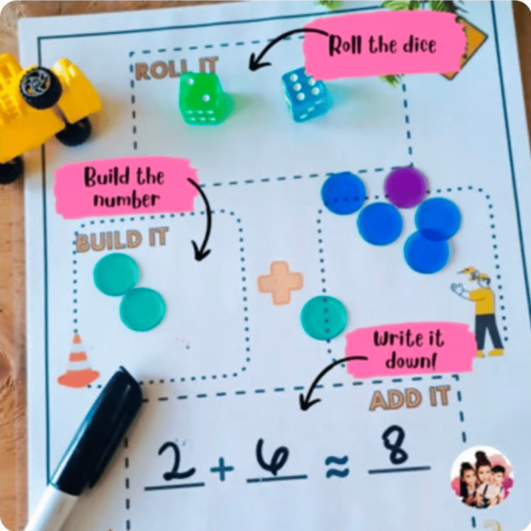 Roll it math game it's a fun and engaging way to teach your kiddo how to add and subtract in a fun way. Use your ten base blocks to add/Subtract one digit problems or two digit problems. You can also use legos, beans, peas or anything you have laying around to keep the fun going. Just print and laminate.