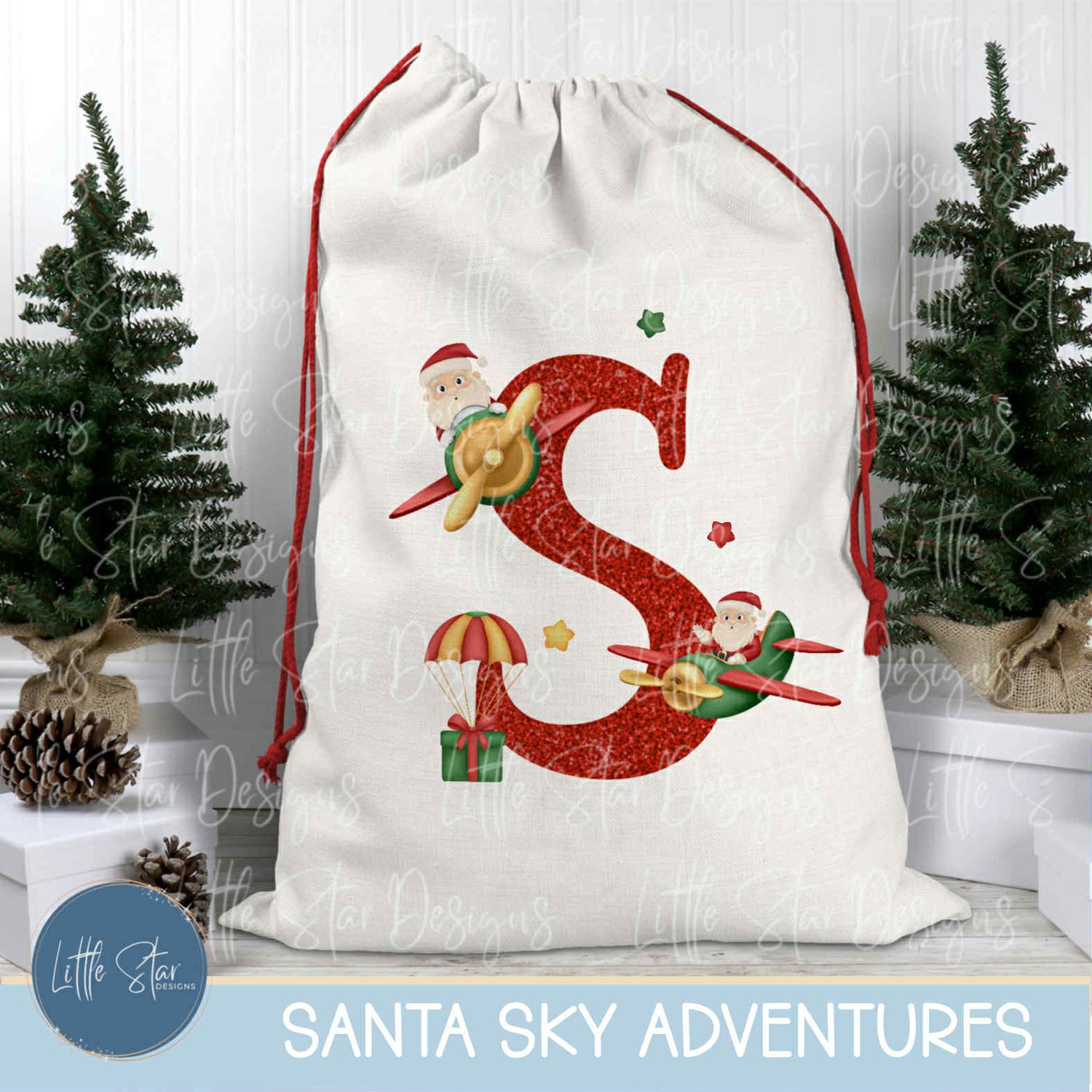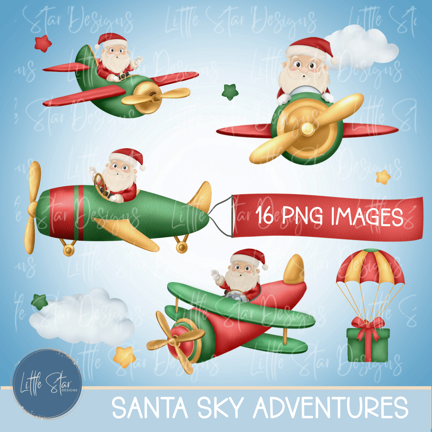 This is a high-quality hand drawn (300dpi PNG) clipart set digital download of my original artwork, titled “Santa Sky Adventures”, designed for sublimation and print.