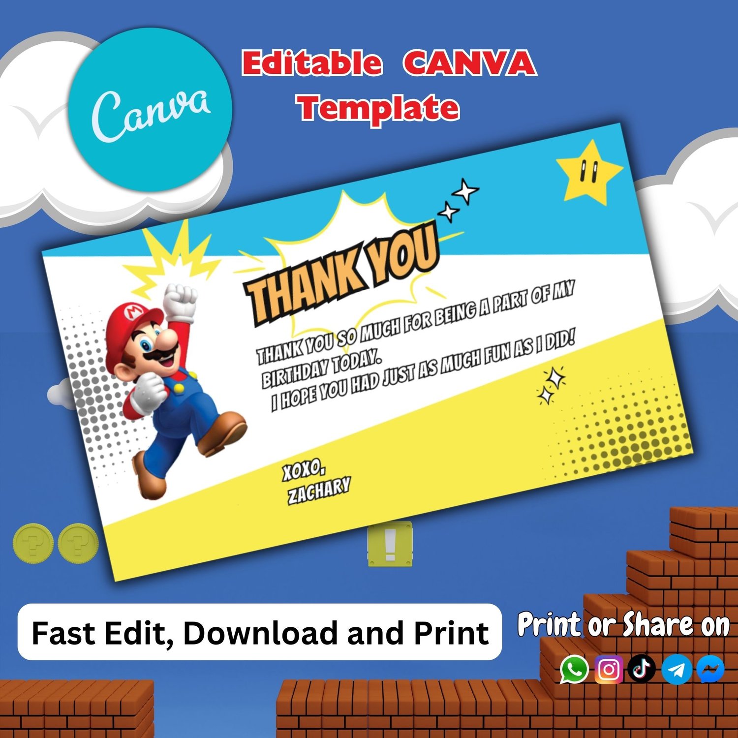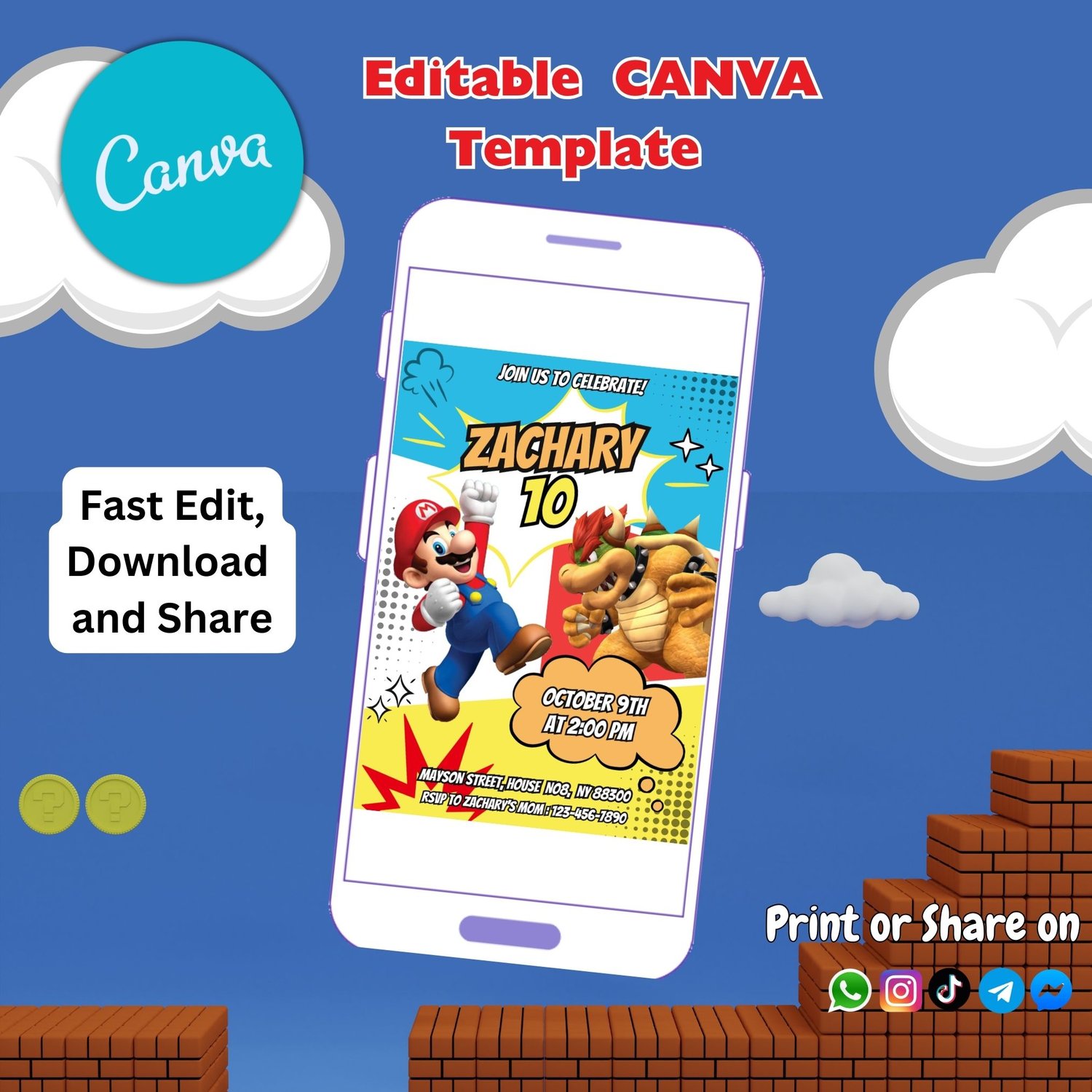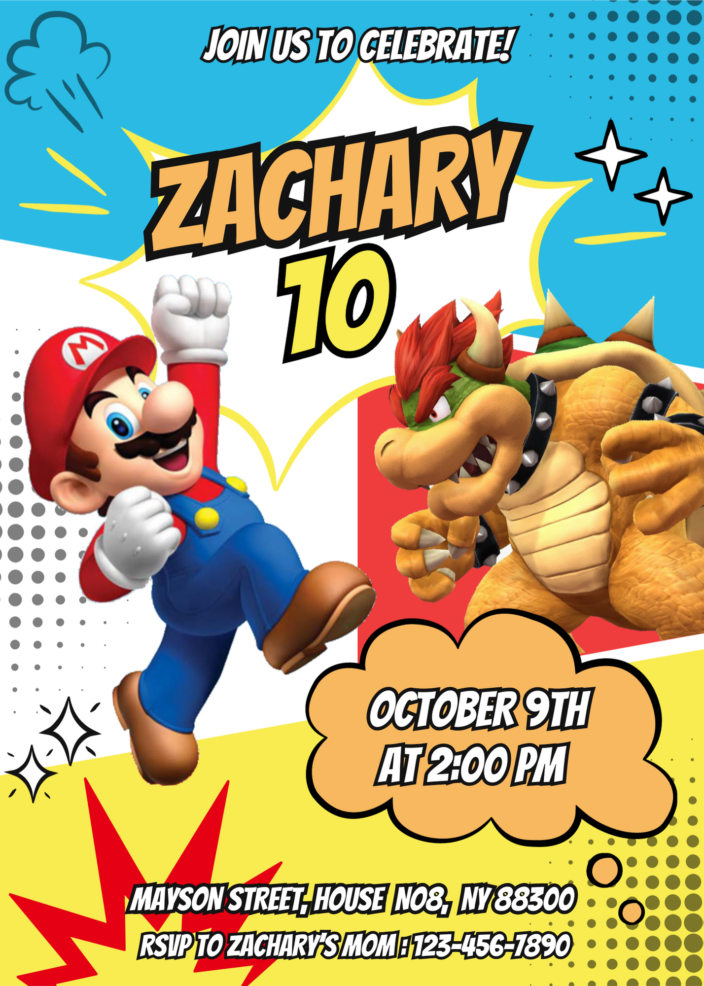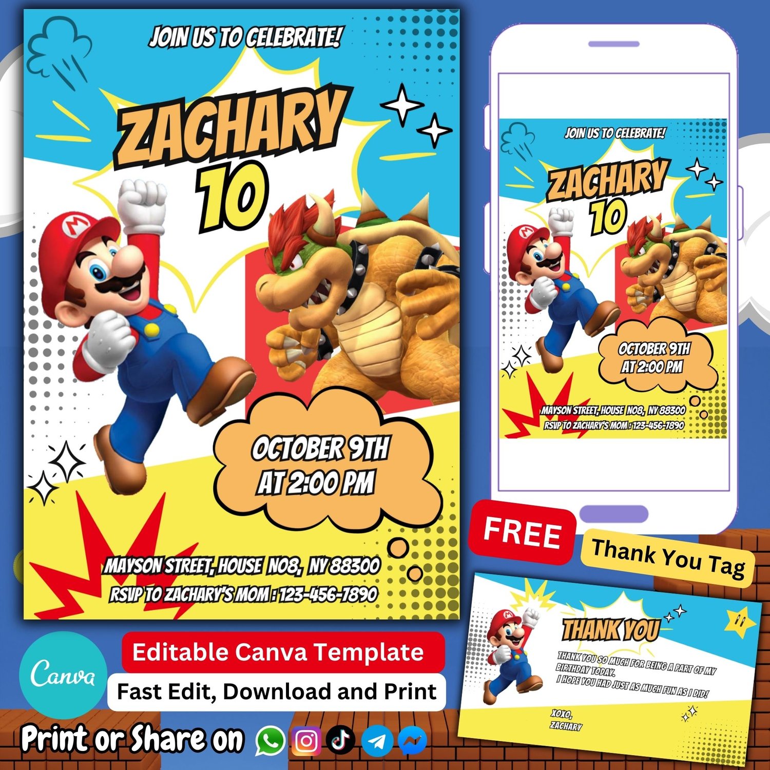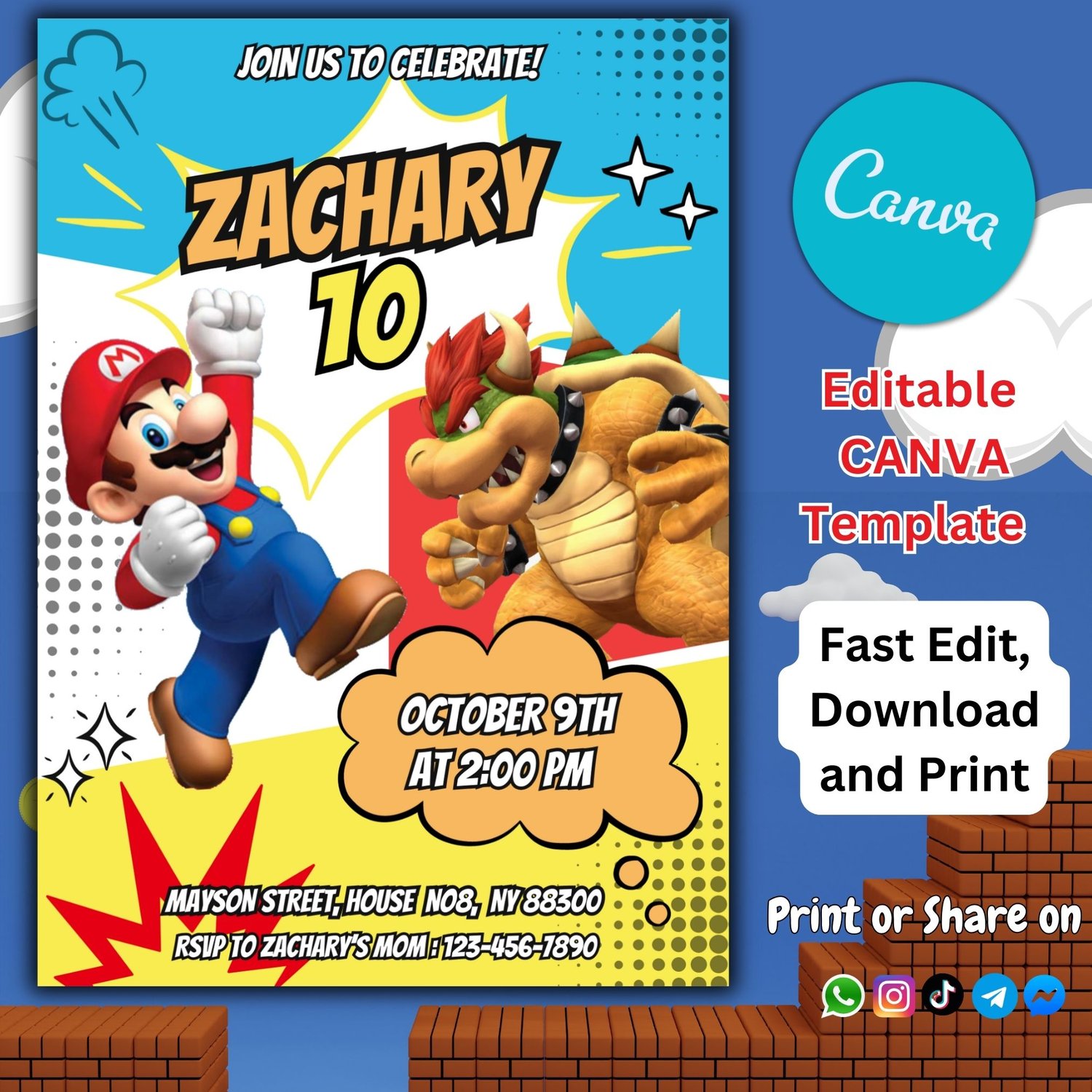 Introducing our Super Mario Birthday Invitation, a perfect tribute to the classic video game! This editable, digital, and printable invitation will have your guests ready to celebrate with Mario & Bowser. Download yours today for a pixel-perfect party!