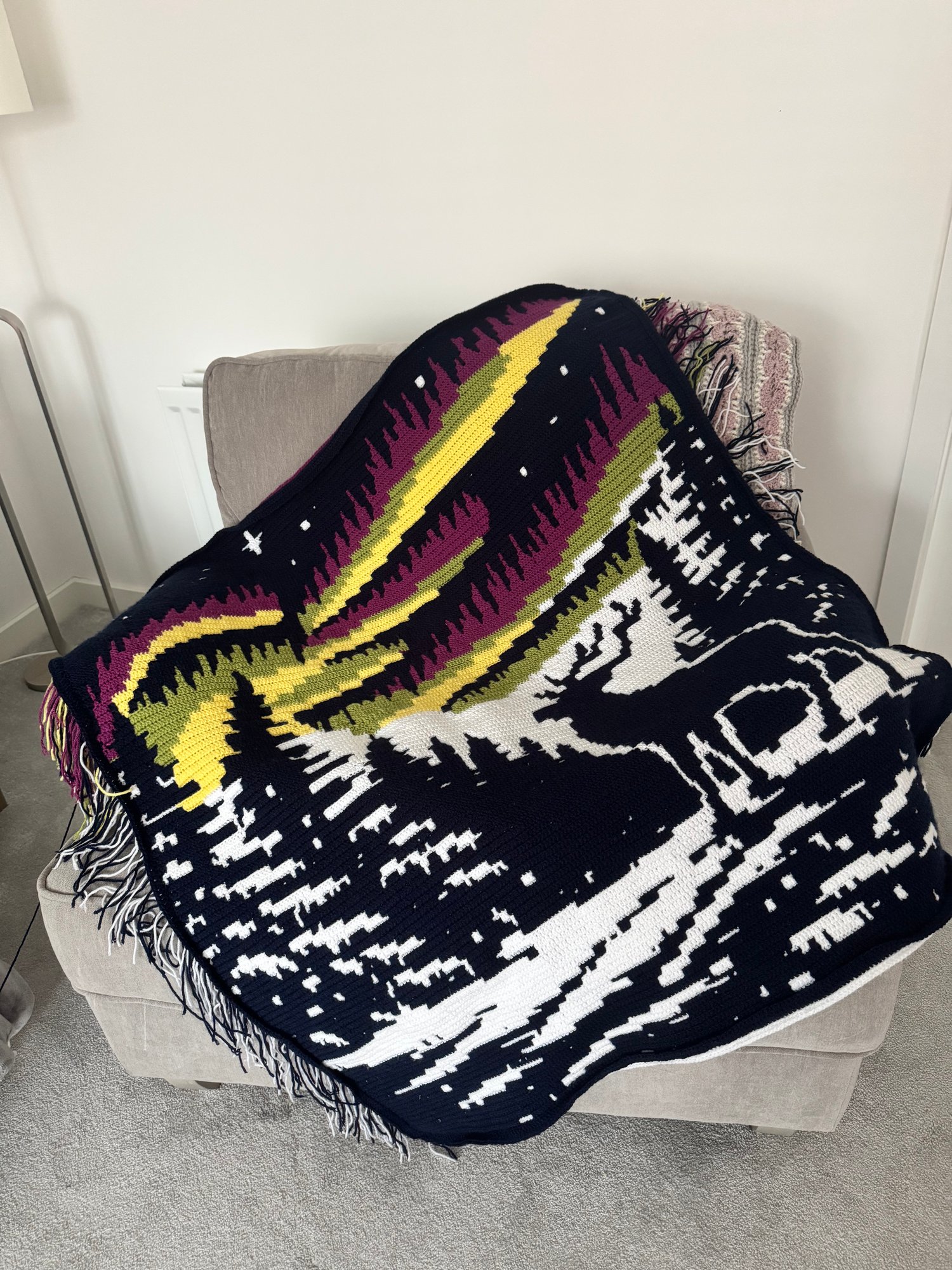 Though the finished blanket looks intricate, the mosaic overlay technique works one colour per row, creating bold, textured colourwork that is surprisingly satisfying and rhythmic to crochet.