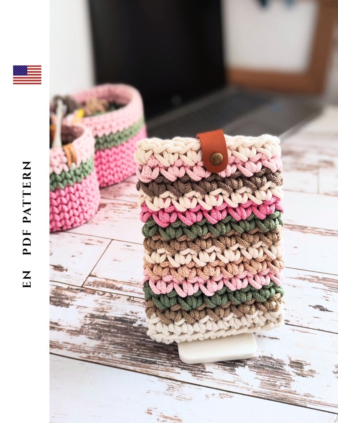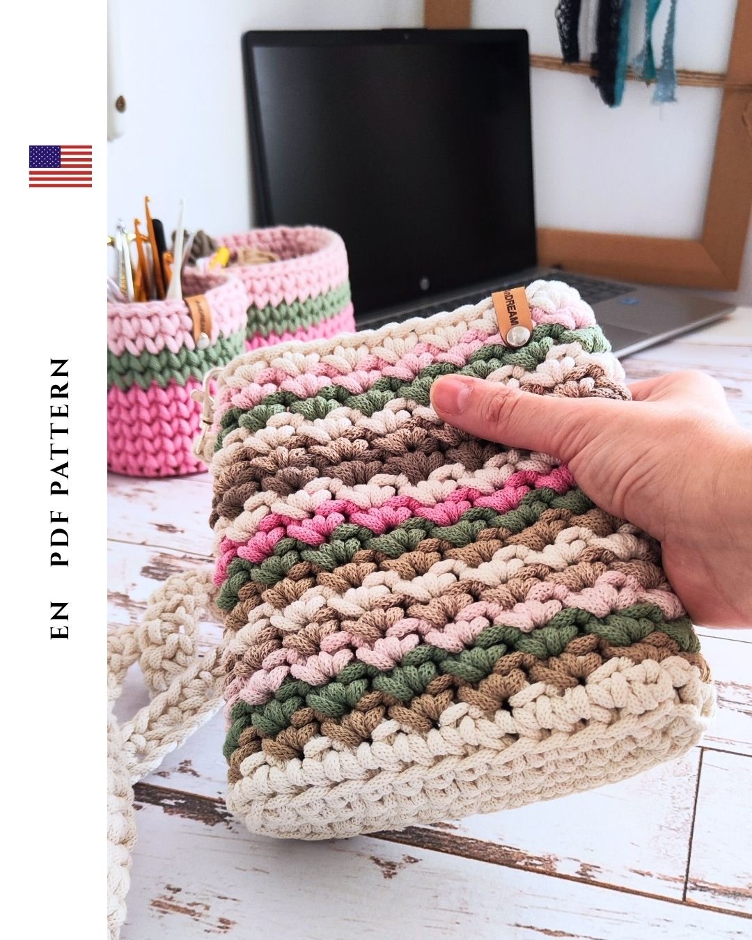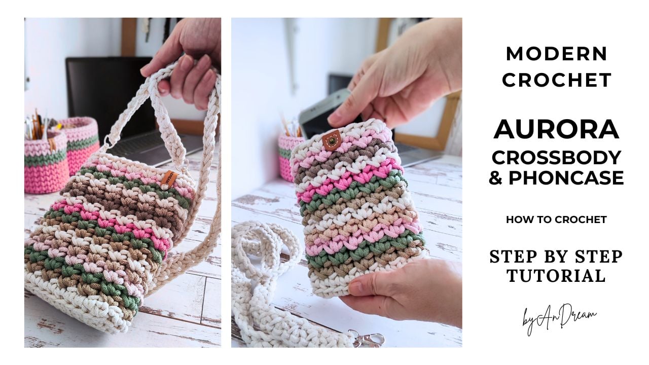 Aurora Crossbody & Phonecase - modern crochet pattern set made with premium cotton rope yarn. Includes both designs in one PDF, step-by-step video tutorial, beginner-friendly instructions. Lightweight, durable, stylish everyday accessories.