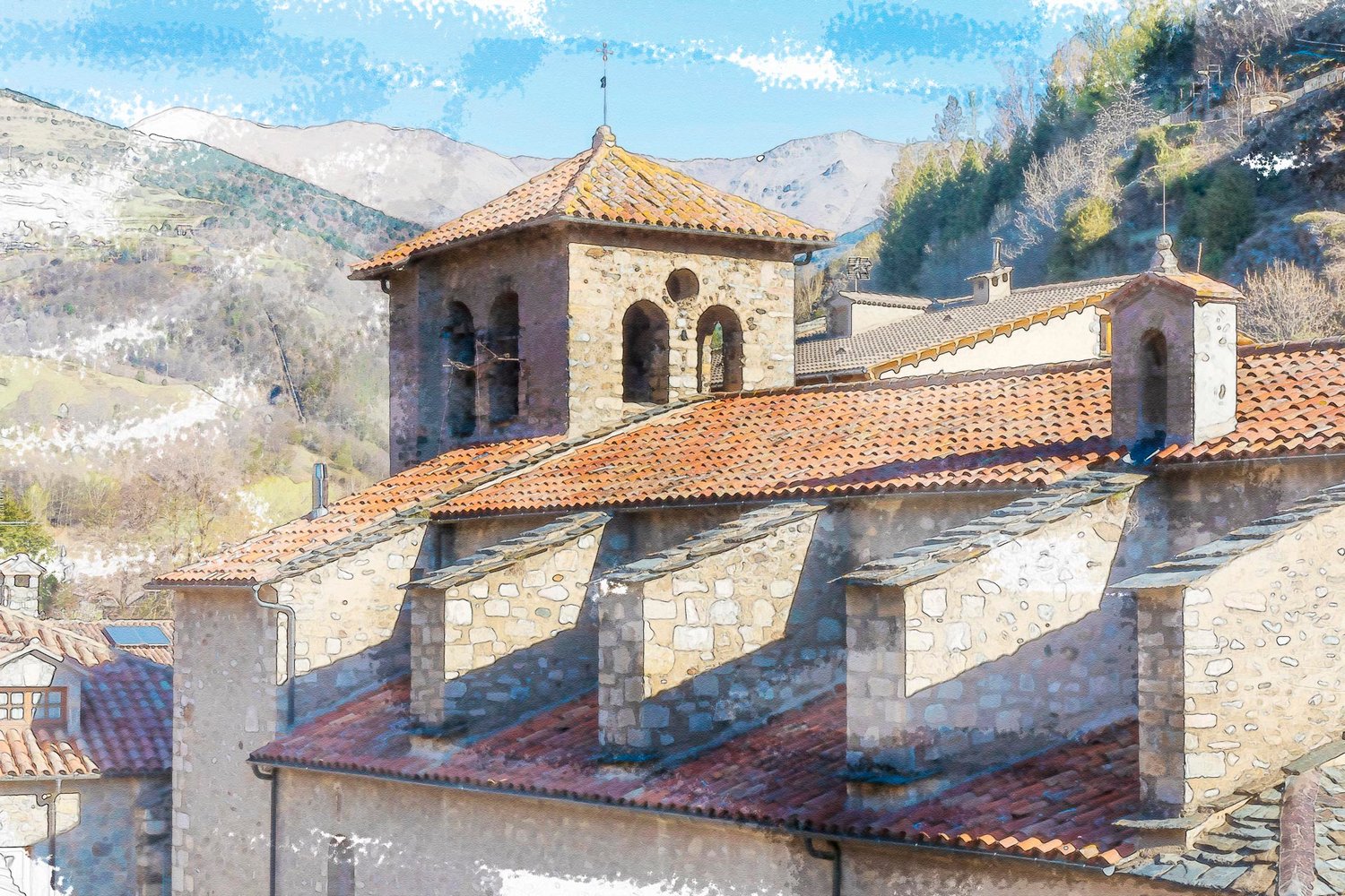 Photograph of the bell tower and roof of the Estamariu church.