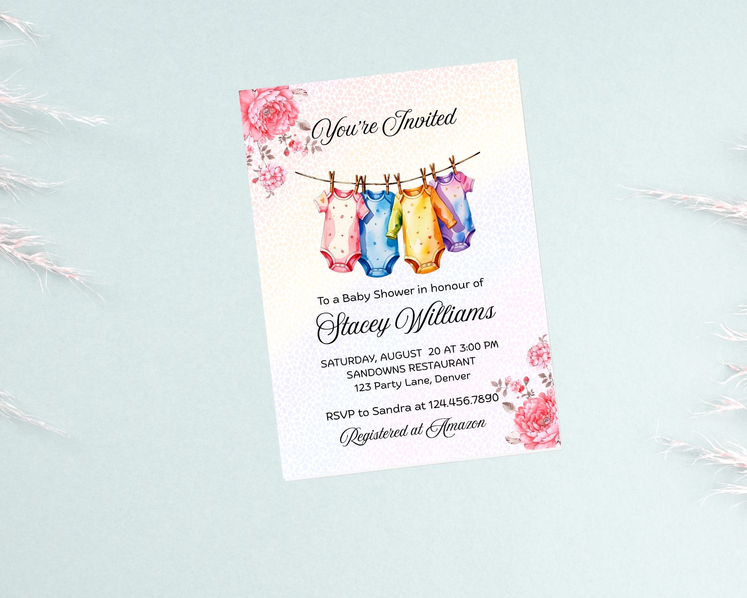 Welcome your little one in style with this charming Watercolor Baby Shower Invitation featuring adorable hanging baby bodysuits and delicate floral accents. This printable and editable invite is ideal for boho-themed baby showers / celebrations.