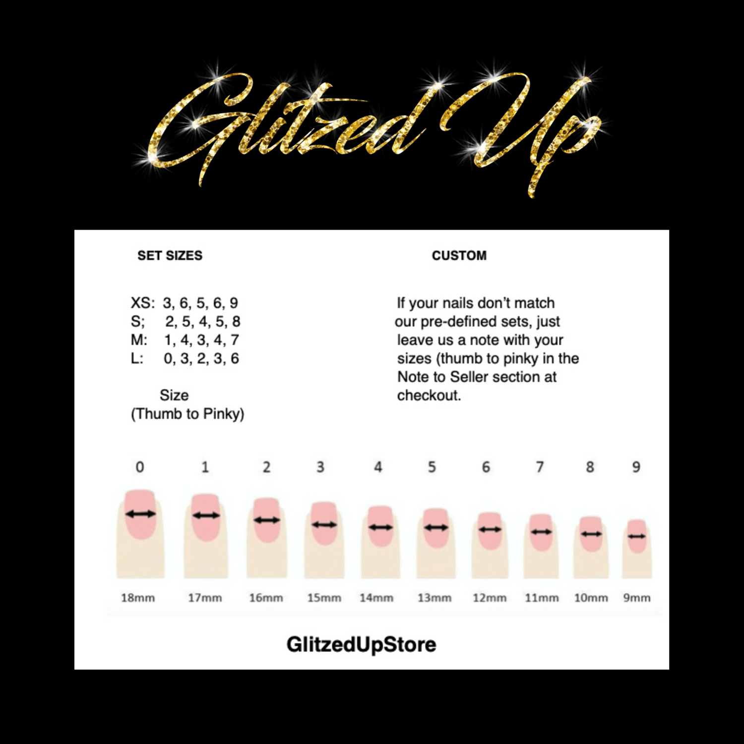 To determine your own nail size please see the SIZING GUIDE in the pictures.