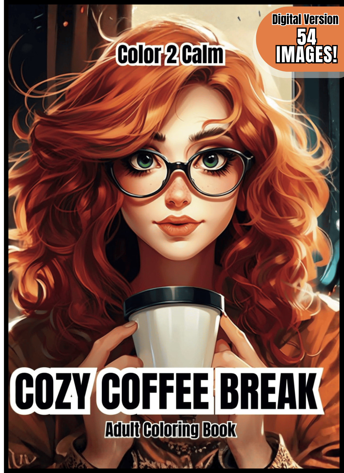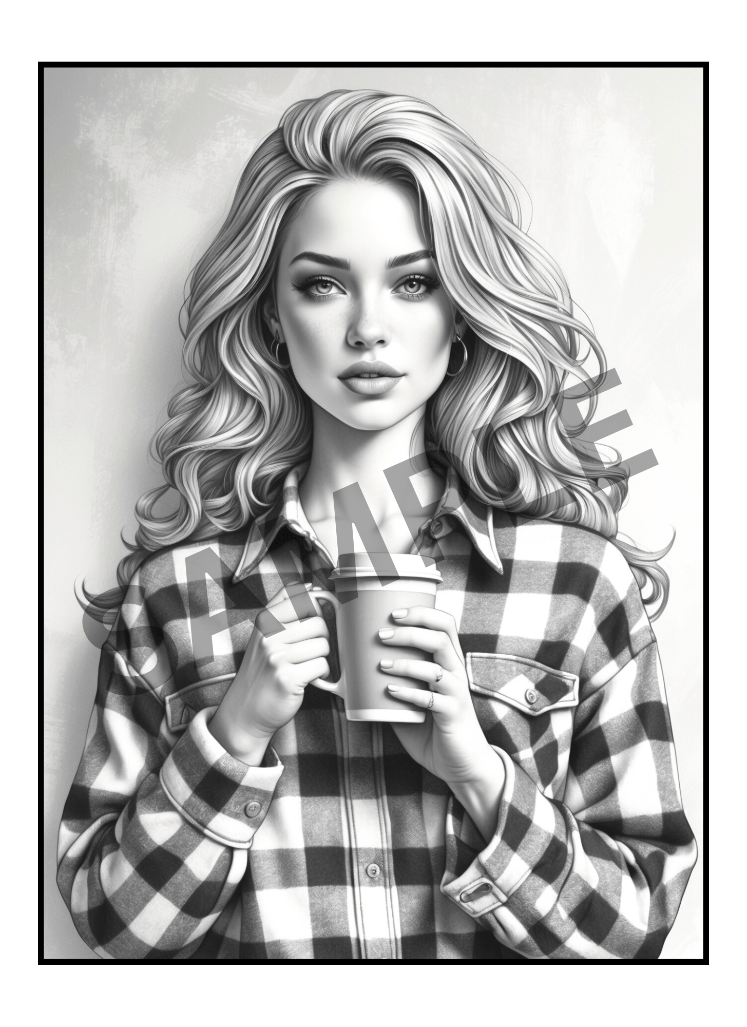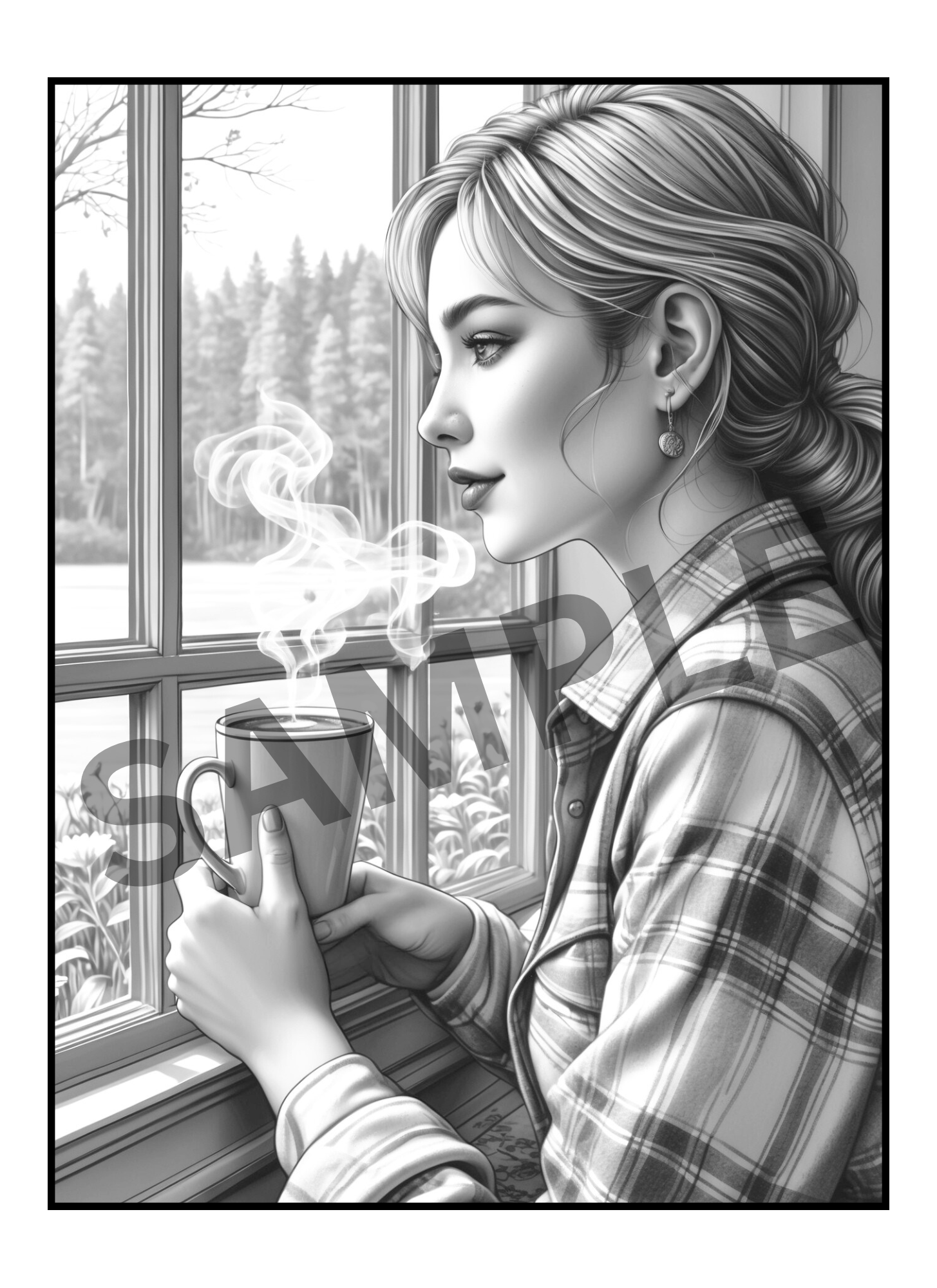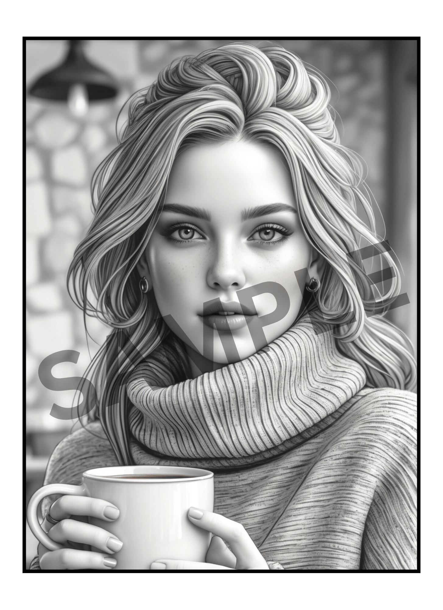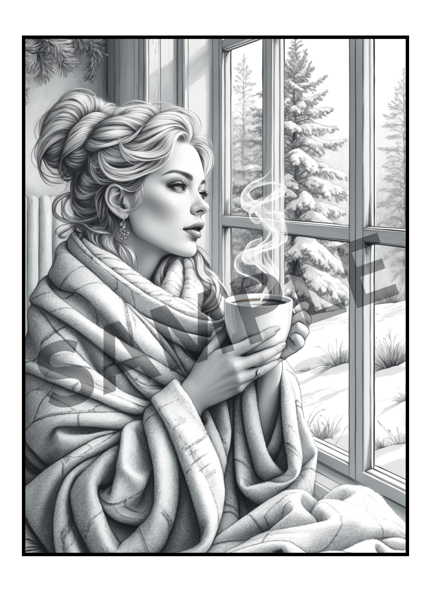 "Cozy Coffee Break Greyscale Coloring Book" features beautifully detailed greyscale illustrations of coffee-loving ladies wrapped in oversized sweaters, surrounded by soft blankets, steaming mugs, and cozy vibes. Grab you own coffee or cocoa and get cozy!