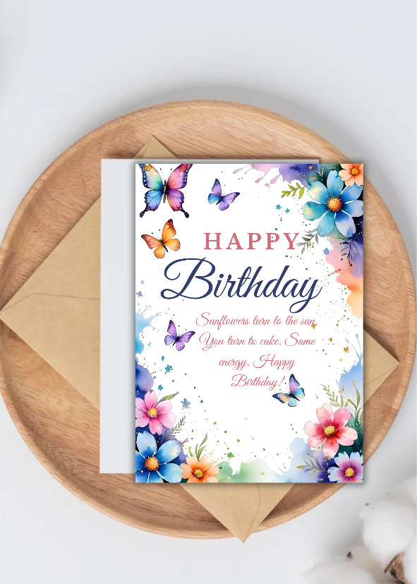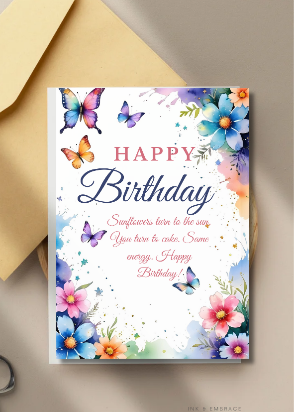 Bring a smile to their face with this delightfully funny 'Happy Birthday' card! Featuring a vibrant watercolor design with graceful butterflies and a beautiful array of colorful flowers, this card is perfect for adding a touch of playful humor to anyone's special day.