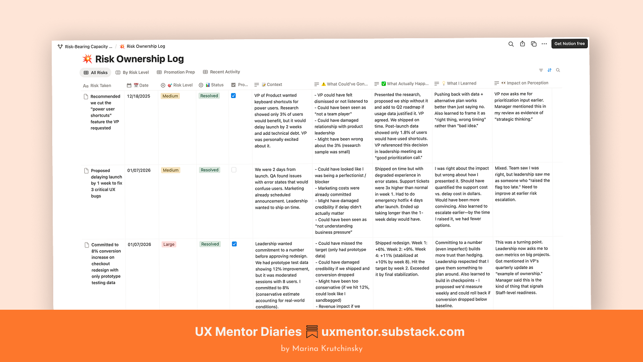 Leadership sees you differently. When you start sharing these examples in 1:1s, your manager's perception shifts. You're not "the reliable executor" anymore. You're "the person who owns outcomes when things are uncertain."