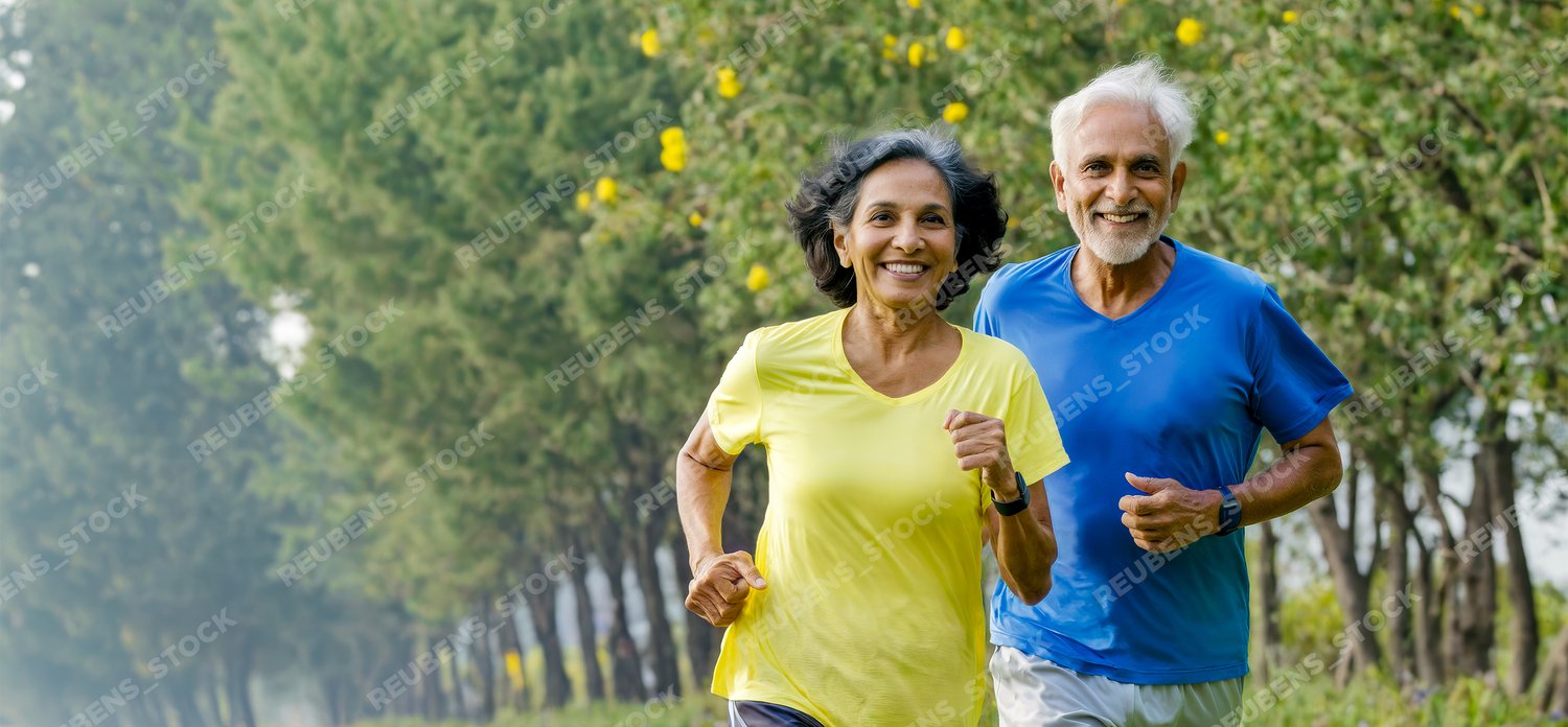 Active Senior Indian Couple Enjoying Morning Jog in Nature. Healthy Aging Concept