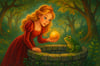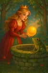 This landscape illustration captures the iconic scene from The Frog Prince, where a golden-haired princess leans over an ancient forest well, gently holding her glowing golden ball. A curious frog sits on the mossy stone edge, gazing up at her — a moment filled with wonder, just before the tale’s magical transformation begins.