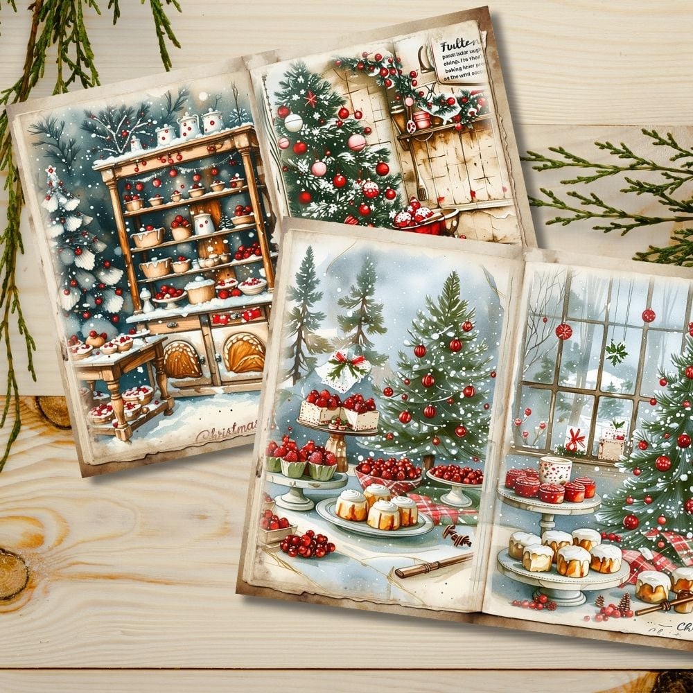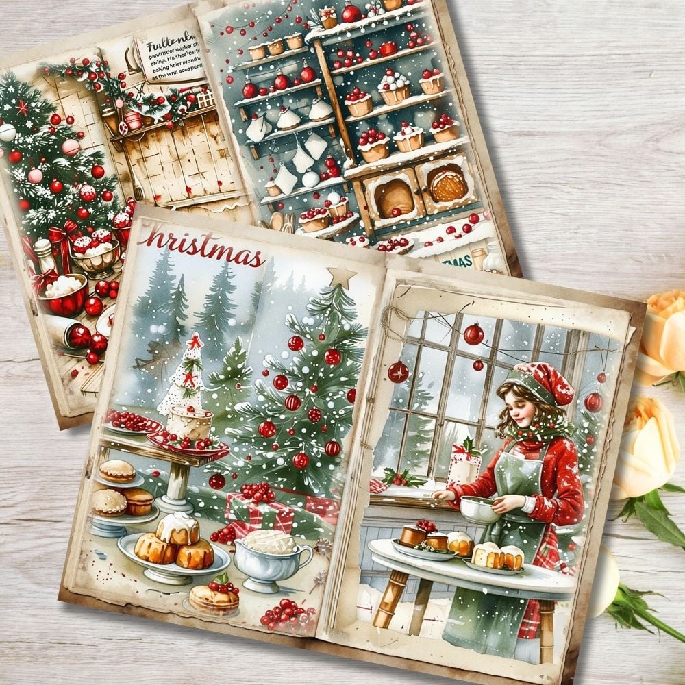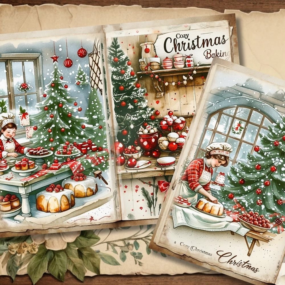 Bring cozy holiday magic into your crafts with this Baking Christmas Printable Journal Paper Set — a delightful collection of vintage-style Christmas kitchen scenes, cozy winter baking moments, decorated trees, and festive farmhouse tables filled with pastries and sweets.